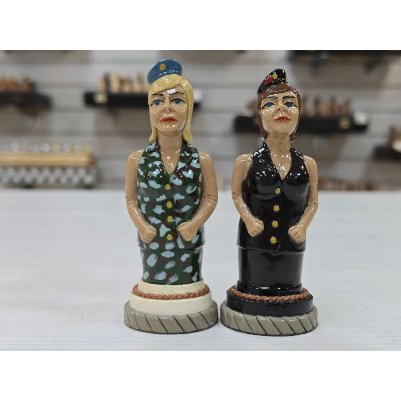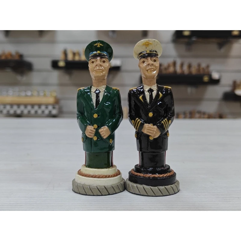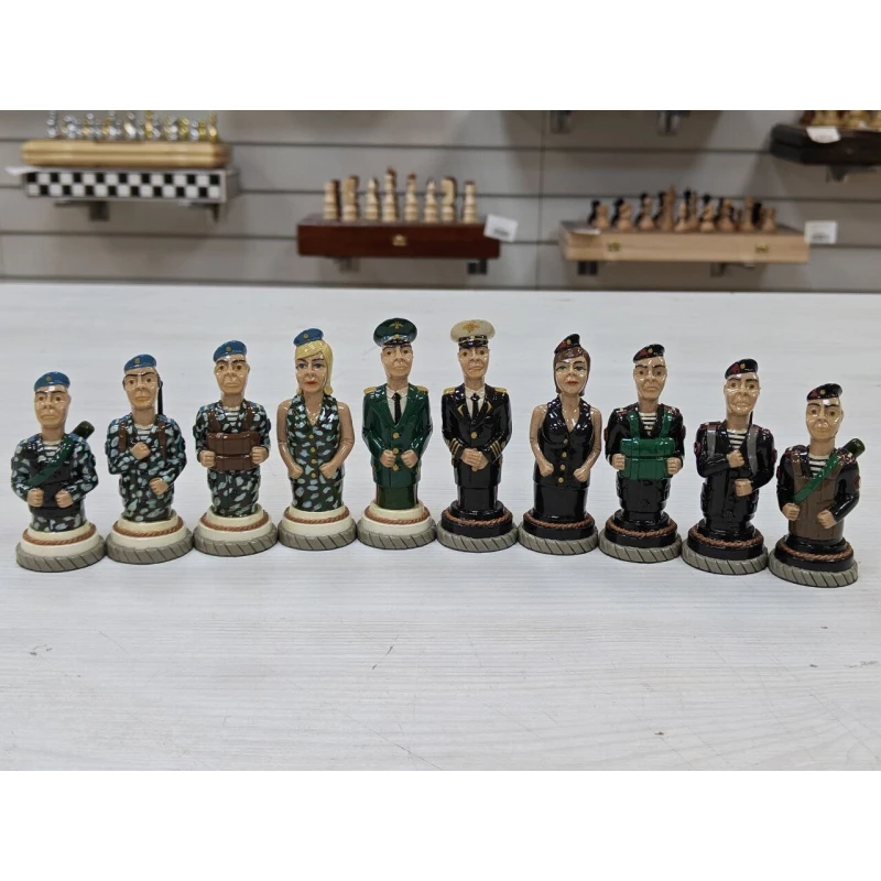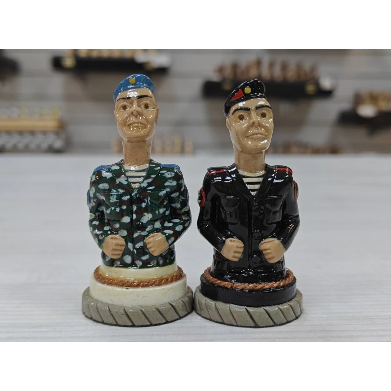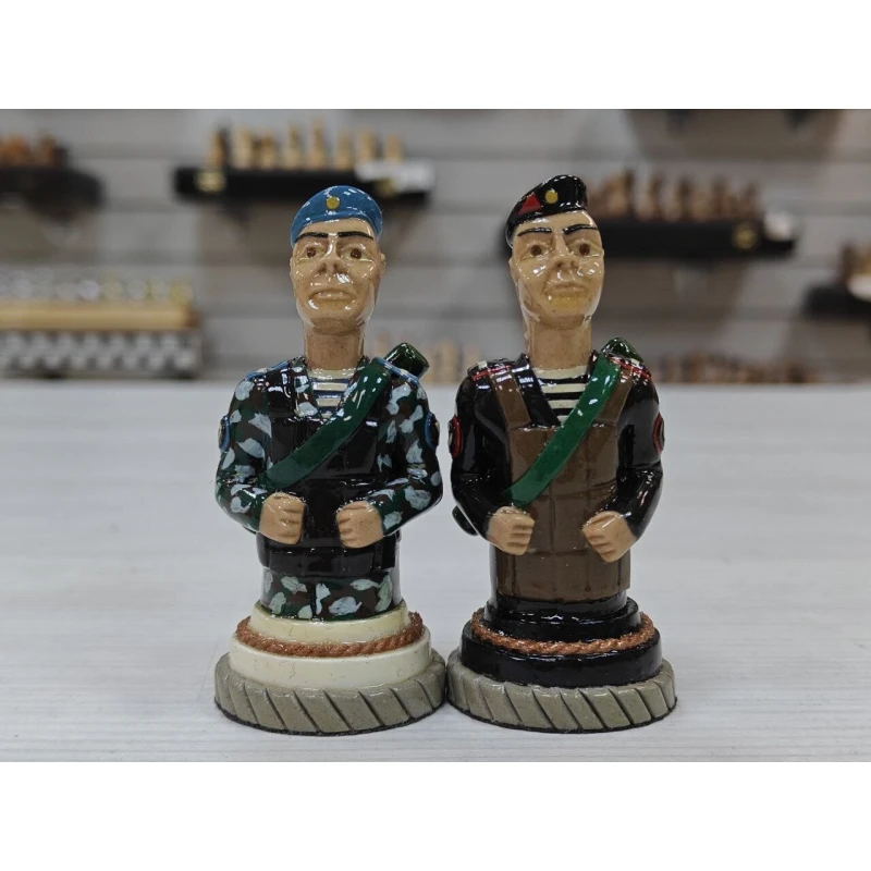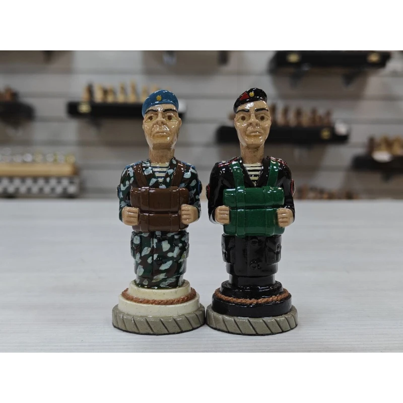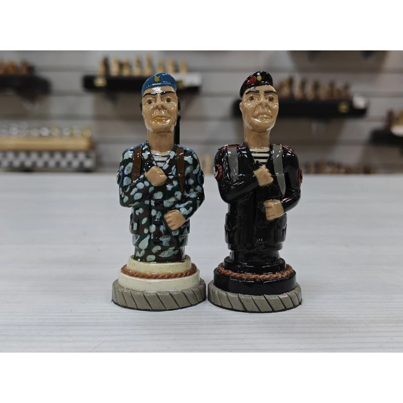 Шахматные фигуры ручной работы изготовлены из хлебного мякиша в местах лишения свободы местными умельцами, изготавливаются штучно, такие фигуры без сомнения можно назвать произведением искусства! Главными героями данного набора стали бойцы Воздушно Десантных Войск и Морской пехоты. Фигуры тактильно приятны благодаря лакированному покрытию и не смогут никого оставить равнодушным! Станут великолепным подарком! Высота короля 9.5см пешка 7, диаметр основания фигур 3.3см