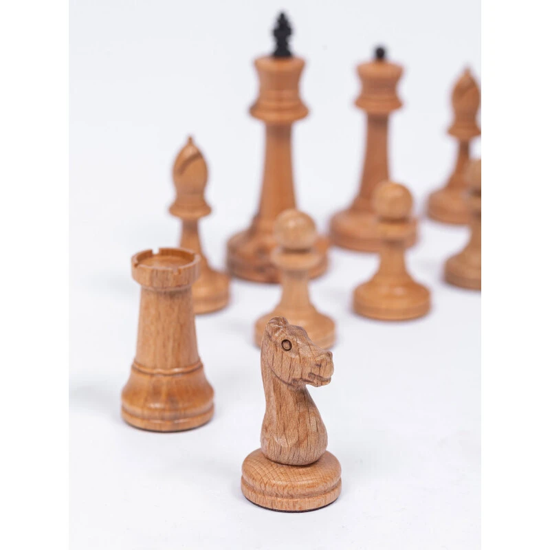 Классические шахматные фигуры в стиле Стаунтон, высота короля 9.5 см, высота пешки 5 см. Материал фигур дерево бук. Сделаны в России. Подойдут для досок с клеткой 4 см, 4.5 см, 5 см. Диаметр основания короля 3.8 см, диаметр основания пешки 2.6 см.