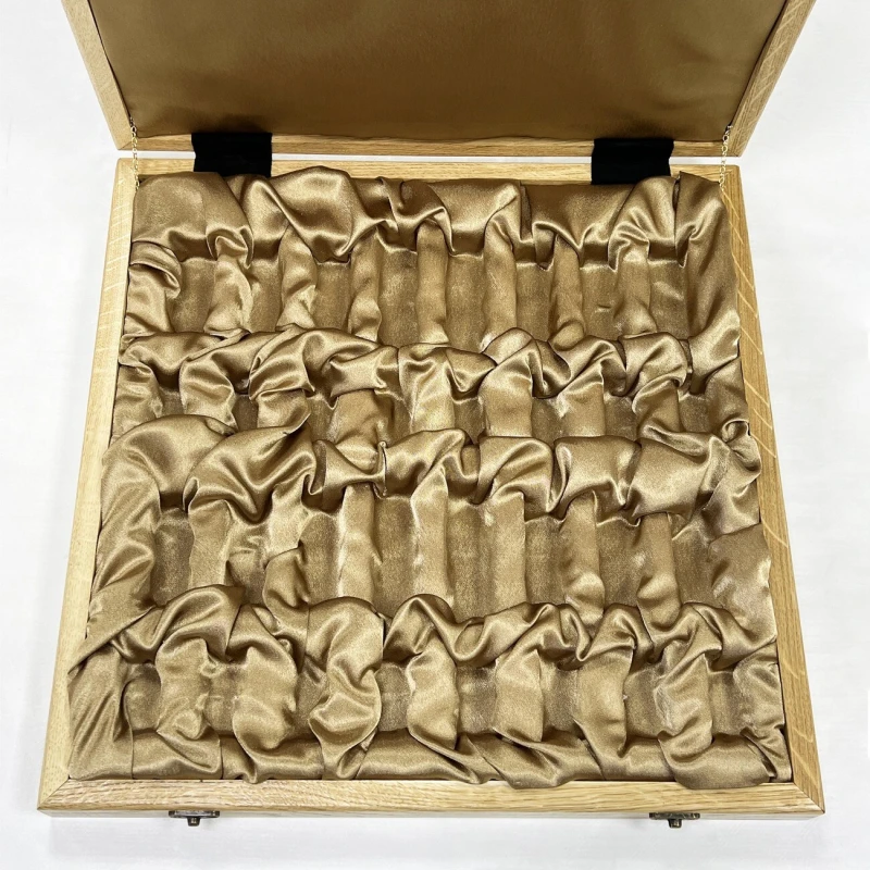 Шахматная доска ручной работы: ларец из кавказского граба с прочными и красивыми замочками, внутри - атласная обивка с ячейками для безопасного хранения фигур. Размер ларца 41 х 41 х 6,5 см. Размер клетки 4,5 см.