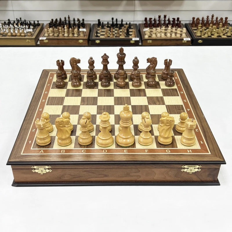 Подарочные шахматы Эндшпиль в ларце сделаны из дерева самшит, палисандр, американский орех и ясень. Внутри доски есть ячейки для хранения фигур.