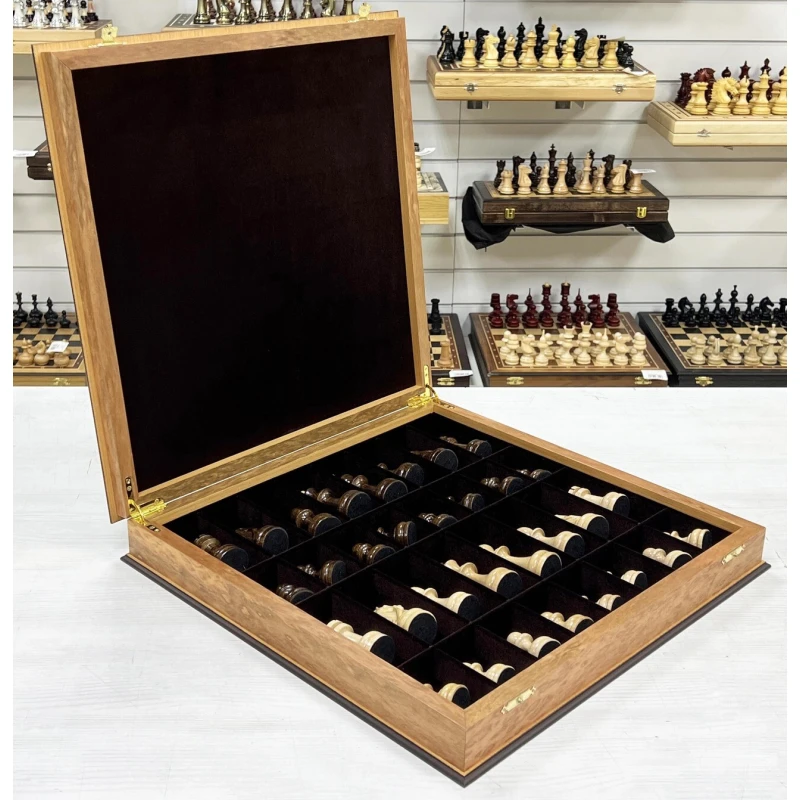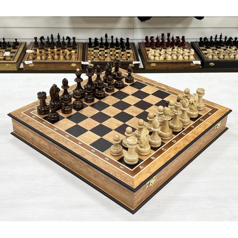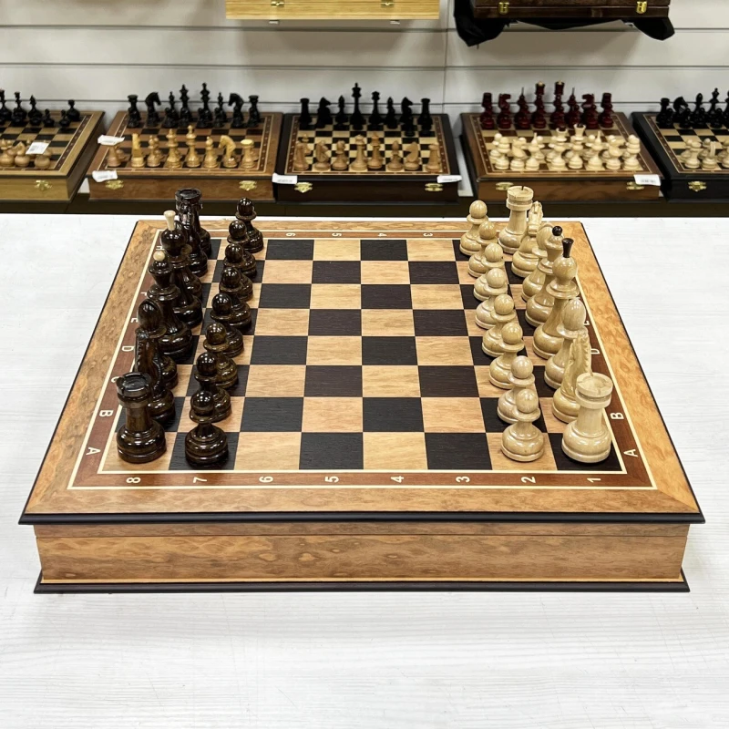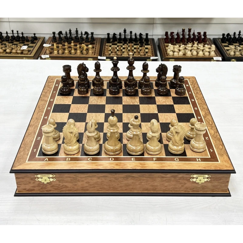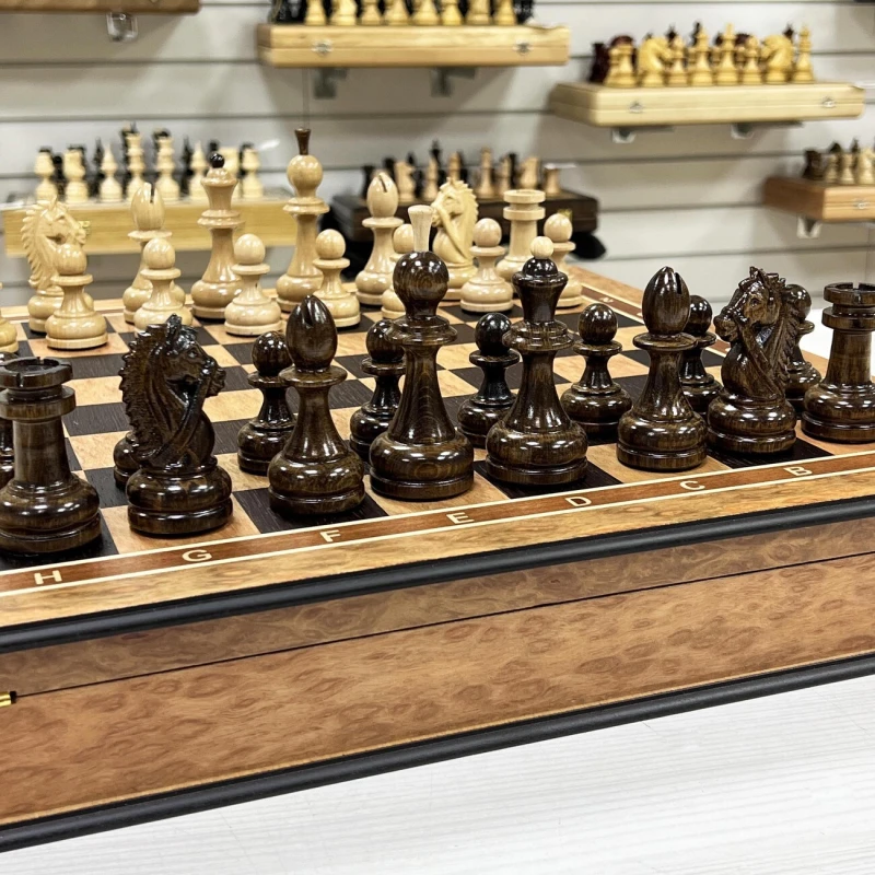 Подарочные шахматы выполненный из эвкалипта с фигурами из кавказского граба. Ларец и фигуры изготавливают вручную российскими мастерами. Отличная идея для подарка всем любителям и профессионалам игры в шахматы. Доска имеет размеры 45х45 см, клетка 4.5см, высота короля 10 см, высота пешки 5см. Ларец имеет индивидуальные ячейки для безопасного и удобного хранения фигур. Шахматные фигуры с утяжелением. Выполнены в классической форме с красивыми резными конями. Шахматы ручной работы.