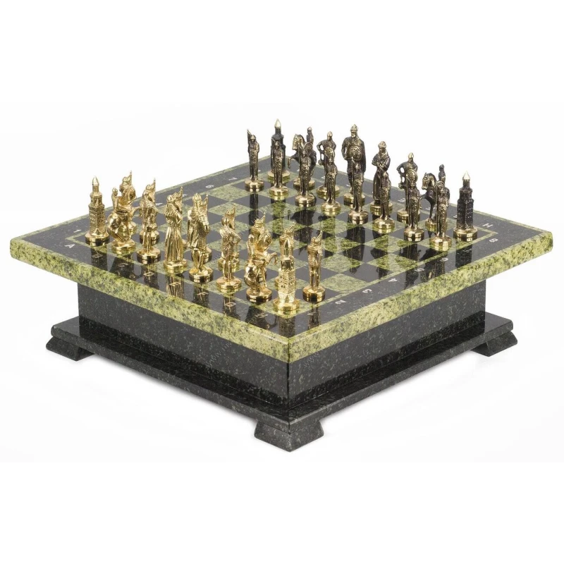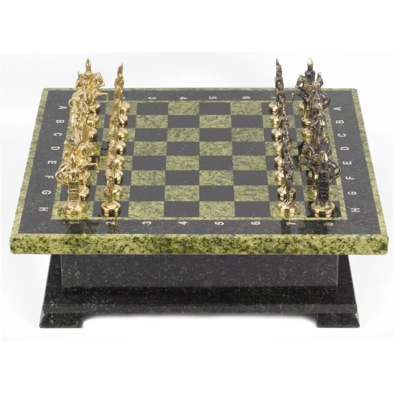 Шахматы из змеевика, фигуры из бронзы. Размер: ларец 420х420х130 мм, клетка 40х40 мм, высота фигур 75-95 мм.