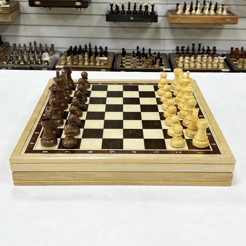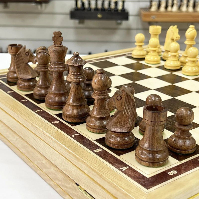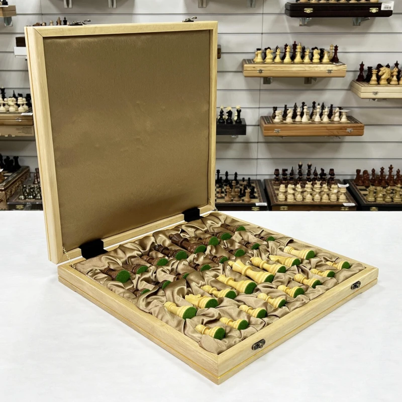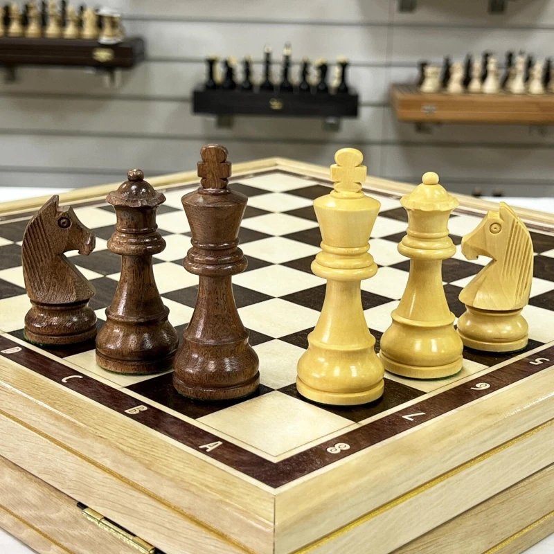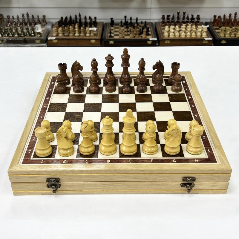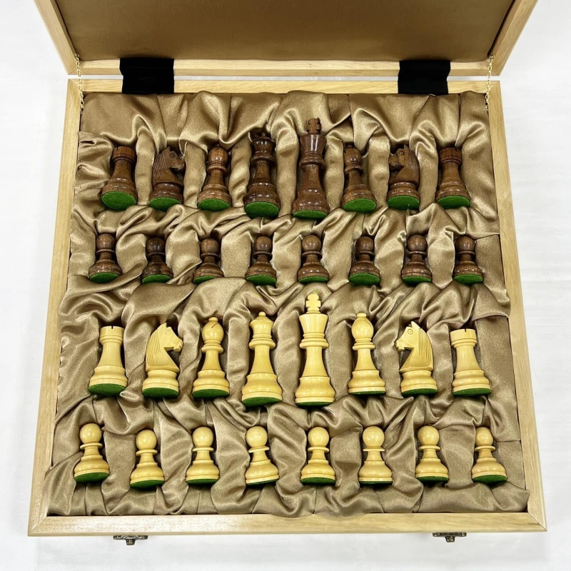 Шахматный ларец, выполненный из граба, станет достойным полем для интеллектуальных сражений. Размер доски 41 на 41 см – оптимальный для комфортной игры и удобного размещения на столе. Размер клетки - 4,5 см. Внутри ларца ячейки для хранения фигур. Шахматное поле имеет размер 36 на 36 см, что соответствует турнирным стандартам. Доска изготовлена вручную, что придает ей особый шарм и уникальность. В комплекте с доской идут турнирные шахматные фигуры, изготовленные вручную индийским мастером из ценных пород дерева. Эти фигуры, отличающиеся высоким качеством исполнения, изысканным дизайном и сбалансированным весом, часто используются на престижных шахматных чемпионатах. Размер короля -9,5 см, размер пешки- 4,5 см. Тщательно подобранные породы дерева подчеркивают уникальность каждой фигуры, а мастерство индийского мастера придает им неповторимый характер. Этот шахматный набор – идеальный подарок для ценителей интеллектуальной игры, изысканных вещей и ручной работы, способный украсить любой интерьер и стать центром внимания в любой компании.