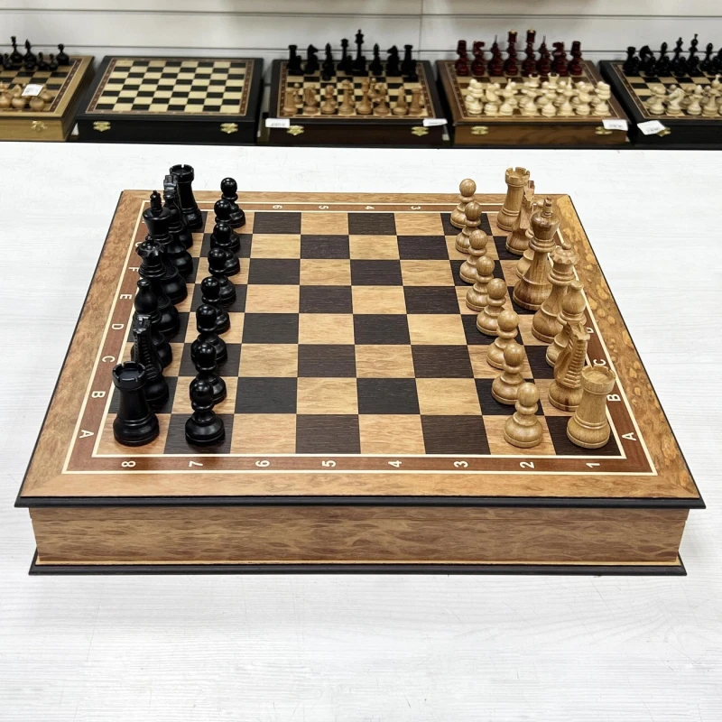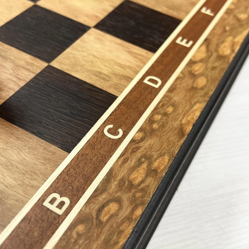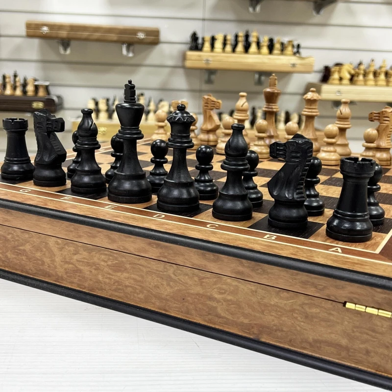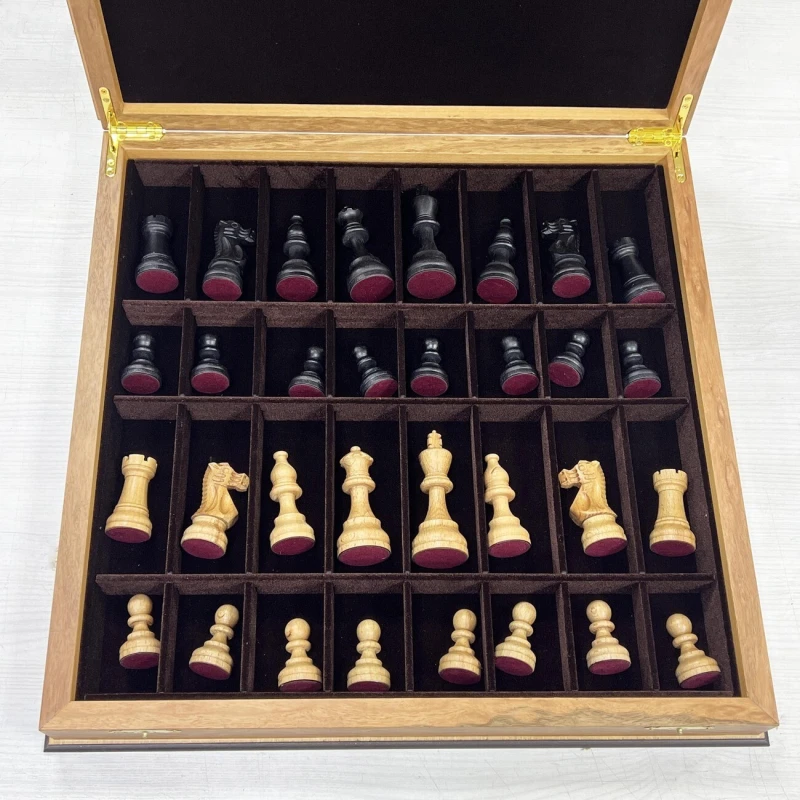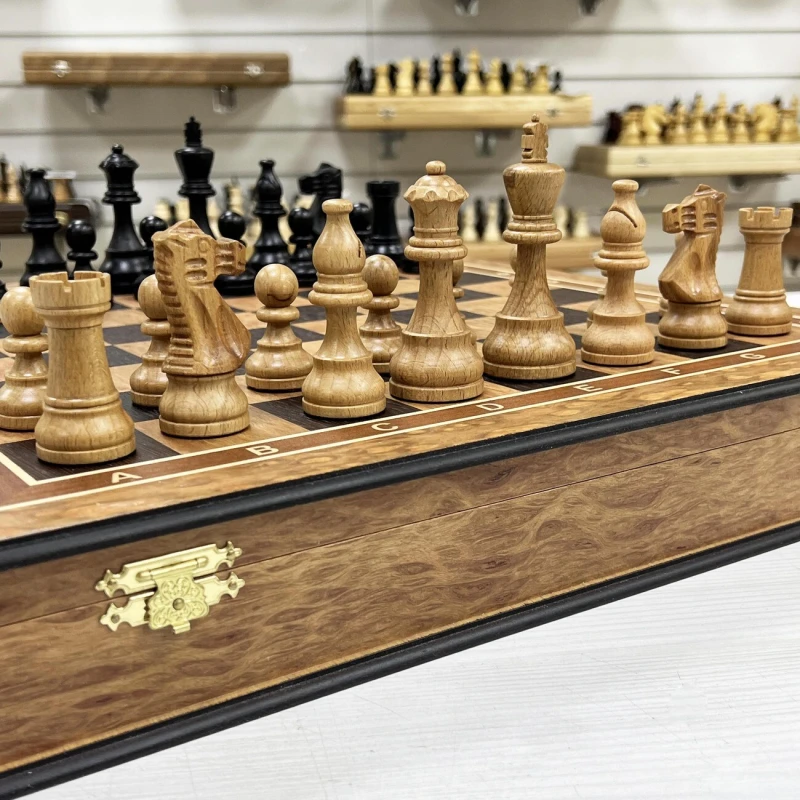 Эксклюзивный шахматный ларец из шпона тропического дерева эвкалипта, которое имеет особенную текстуру