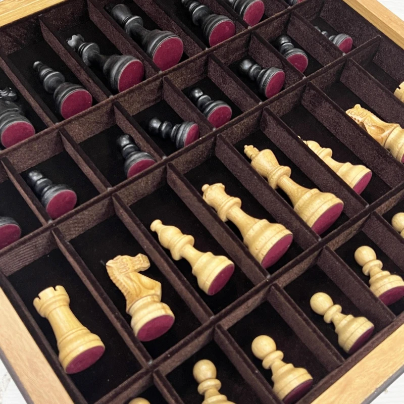 - Дополнительные функции:ячейки под фигуры, внутренняя отделка бархатом