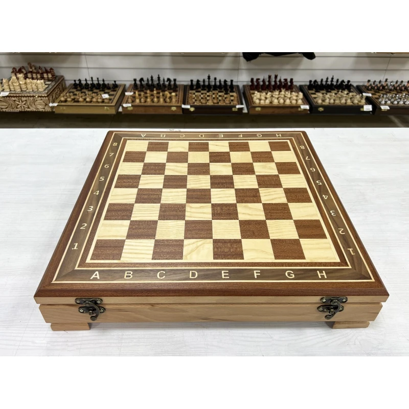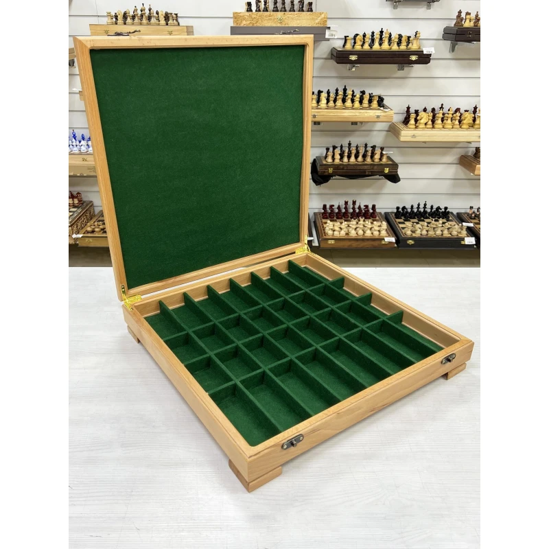 Изысканный шахматный ларец ручной работы, выполненный в технике маркери, который станет настоящим украшением любой коллекции. Размер ларца составляет 52 на 52 см с толщиной 8 см, он создан из массива бука, что обеспечивает прочность и долговечность. Внешняя поверхность украшена изящными вставками из шпона красного дерева и ясеня, придающими изделию элегантный и современный вид. Внутри ларца расположены аккуратные ячейки для хранения шахматных фигур, что позволяет удобно хранить и транспортировать комплект. Этот уникальный предмет сочетает в себе мастерство ручной работы, высокое качество материалов и изысканный дизайн, делая его идеальным подарком или ценным дополнением к интерьеру любителя шахмат.