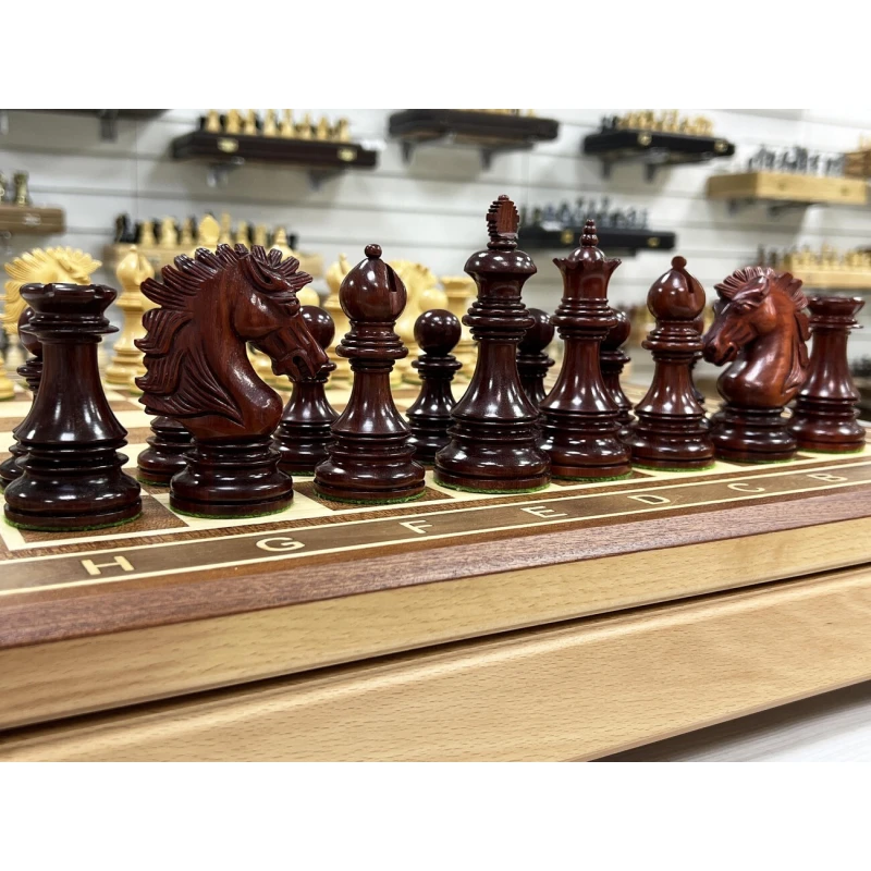 Размер доски 51.5 на 51.5 см. Размер клетки 5 на 5 см. Высота короля 11.5 см, высота пешки 6.7 см. Шахматные фигуры сделаны из самшита и палисандра. Фигуры с утяжелением. Дизайн фигур Веллингтон. Особенность набора шахмат в потрясающих шахматных конях в художественном исполнении ручной работы. Шахматная доска собирается вручную из бука, красного дерева и ясеня в технике маркетри. Внутри ларца ячейки для хранения фигур.