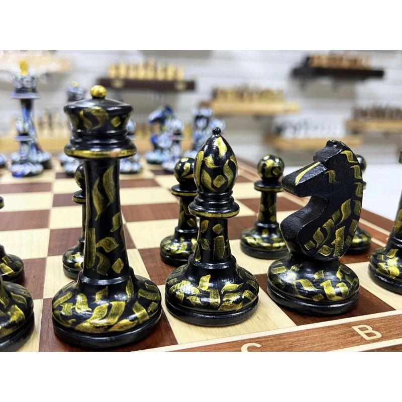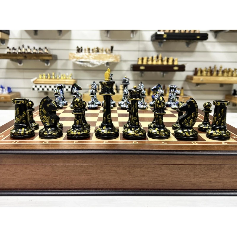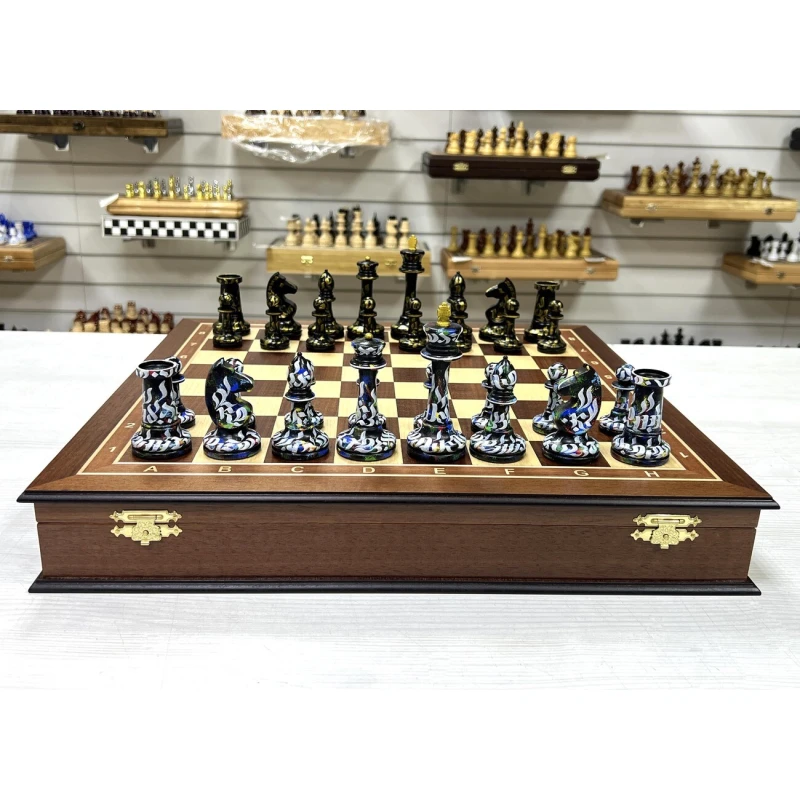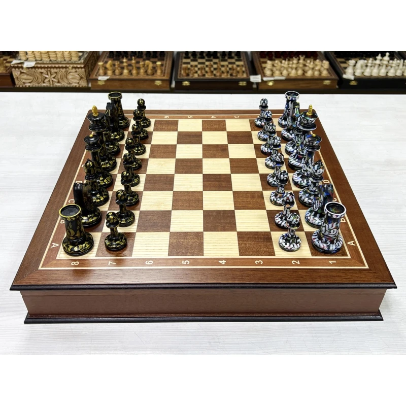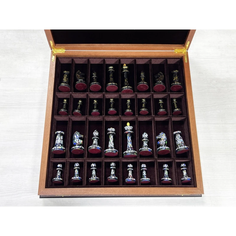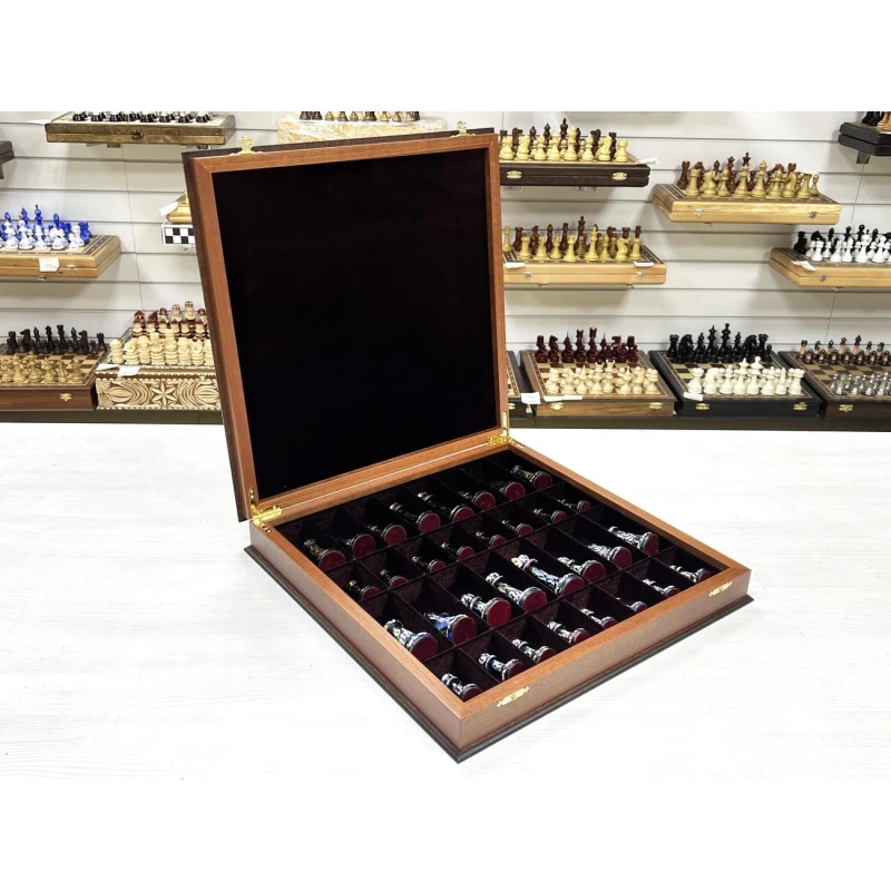 Шахматный ларец из ценной породы красного дерева с эксклюзивными фигурами, расписанными вручную