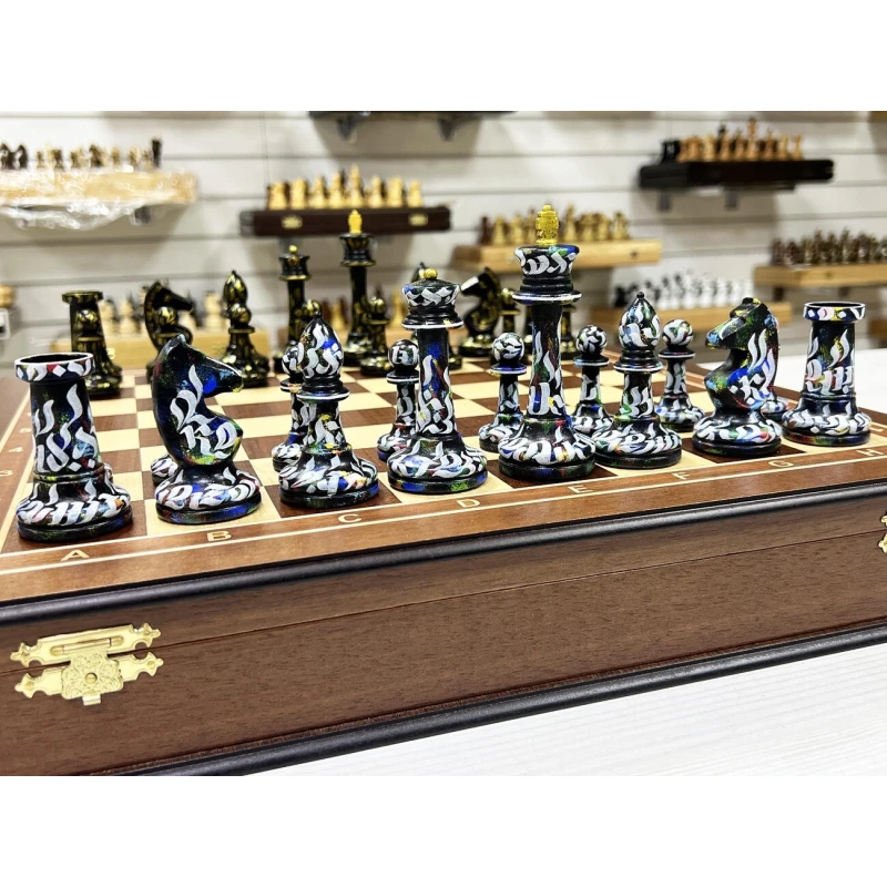 Шахматный ларец из ценной породы красного дерева размером 45 х 45 см и высотой 8 см. Внутри ларец имеет ячейки под фигуры, отделанные бархатом. Фигуры Каллиграфия в комплекте - главная особенность этого набора. Каждая фигурка расписана художником вручную и имеет свой неповторимый рисунок. Данный комплект шахмат выбирают те, кто любит абсолютный эксклюзив.
