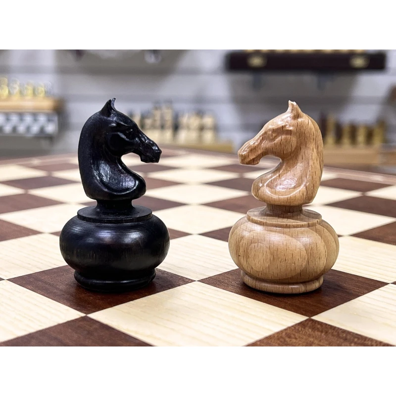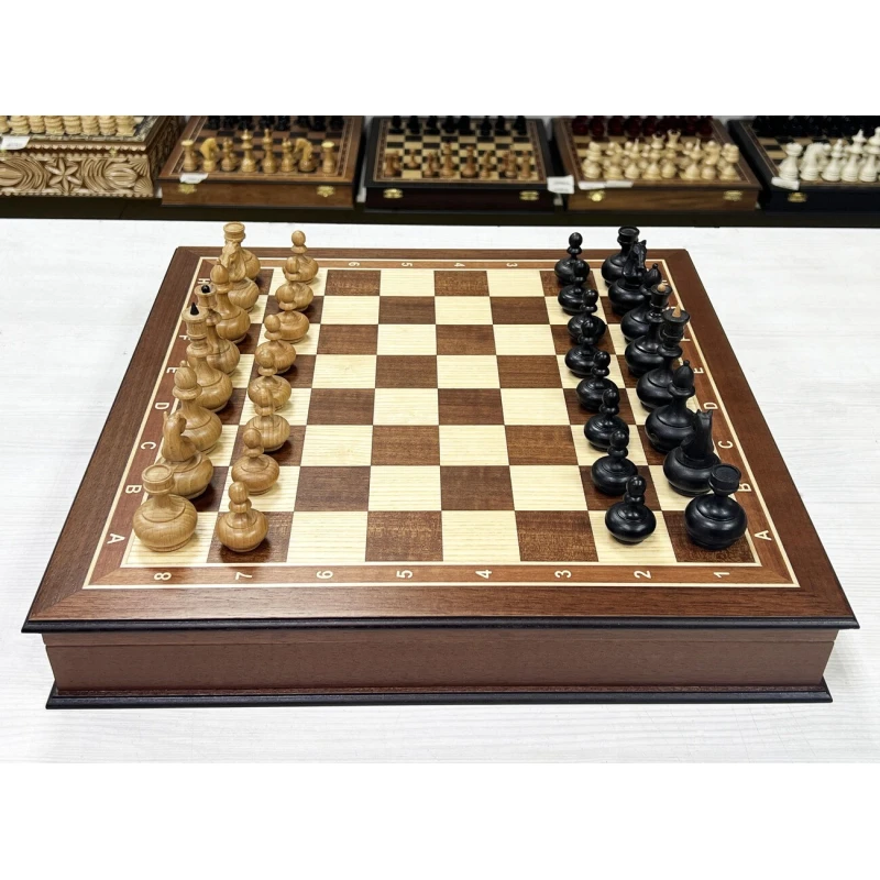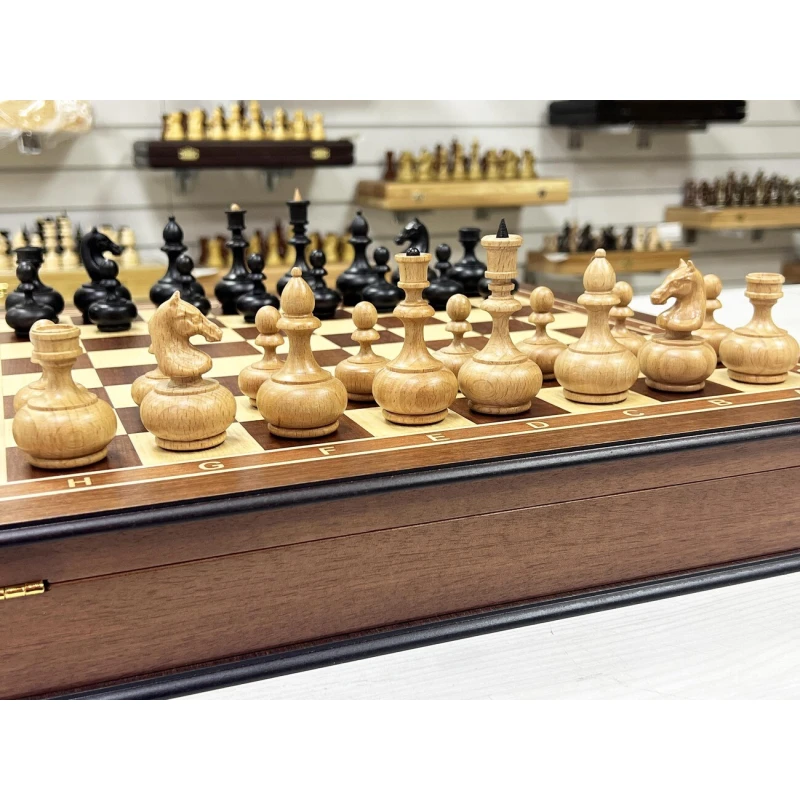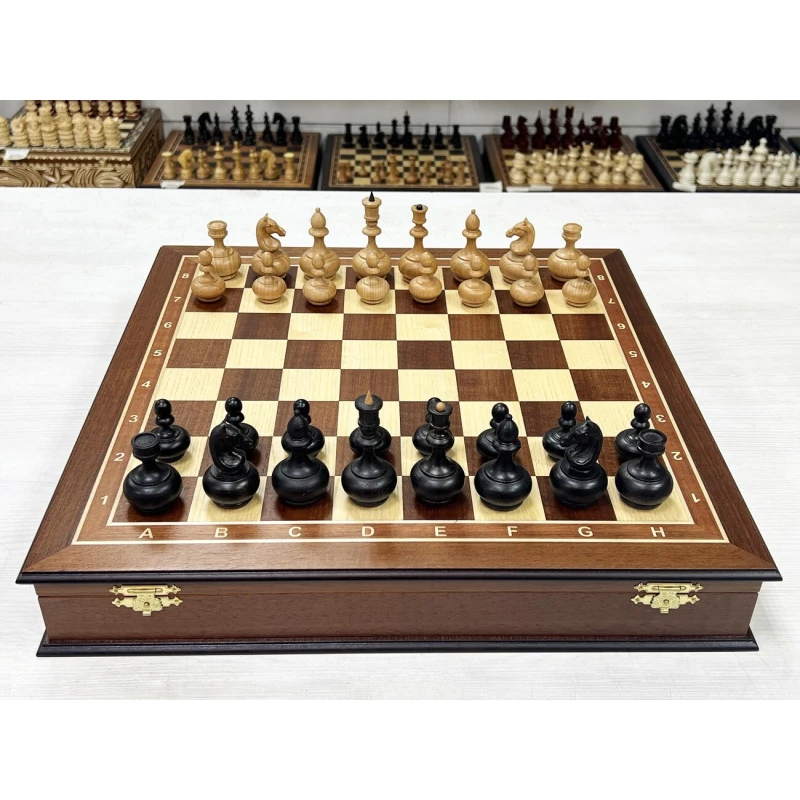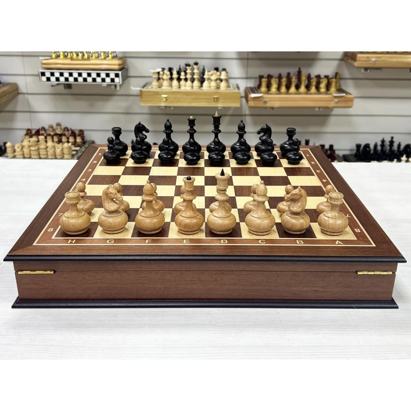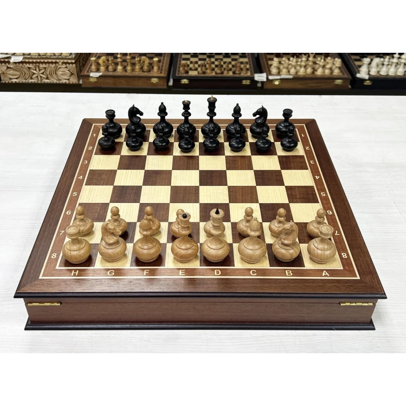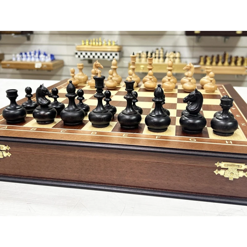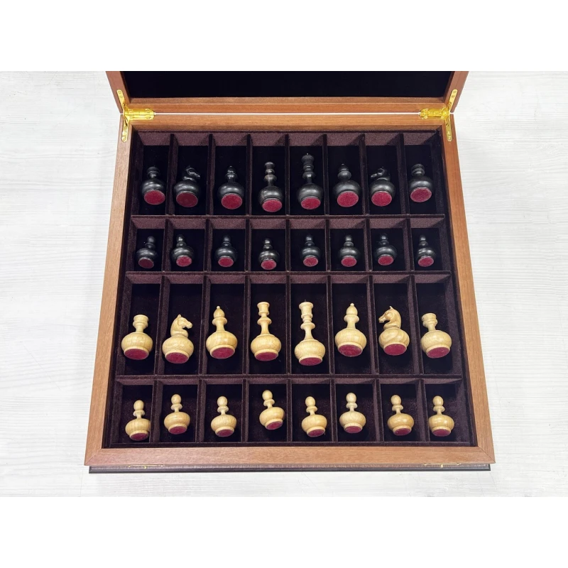 Шахматный ларец из ценной породы красного дерева в комплекте с оригинальными шахматными фигурами в дизайне образца ХIХ века