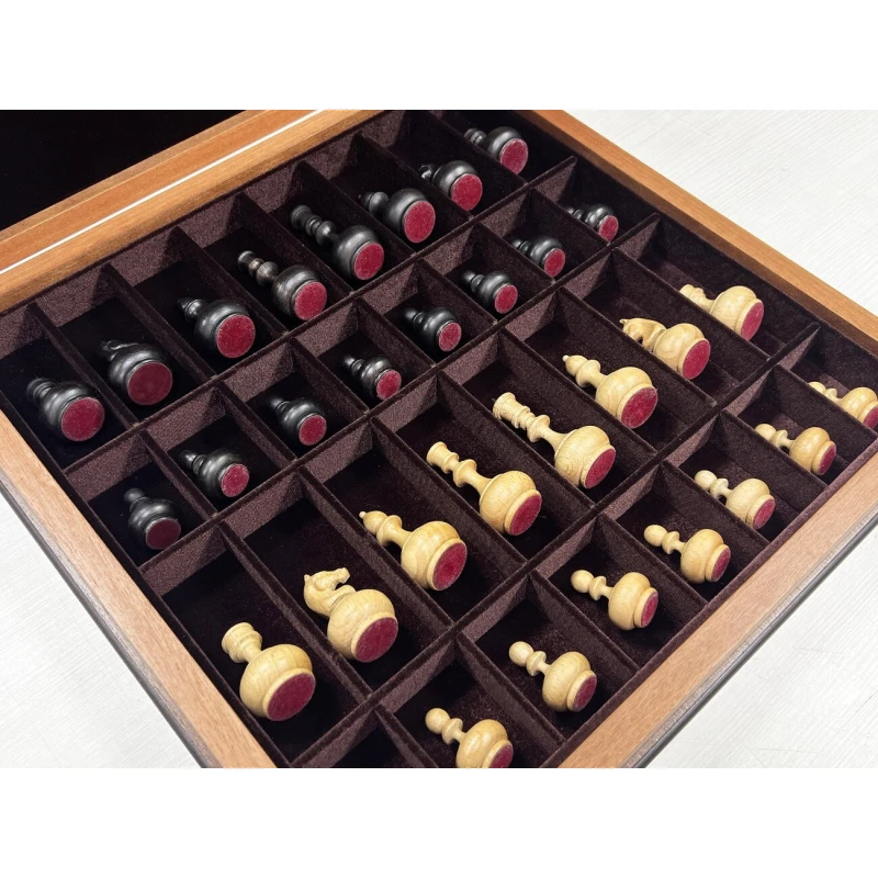 Шахматный ларец из ценной породы красного дерева размером 45 х 45 см и высотой 8 см. Внутри ларец имеет ячейки под фигуры, отделанные бархатом. Фигуры Неваляшки в комплекте изготовлены из дерева бука и полностью повторяют дизайн английских шахматных фигур ХIХ века. Фигуры без утяжеления и имеют подклейку основания из бархата, для предотвращения царапин на игровом поле.