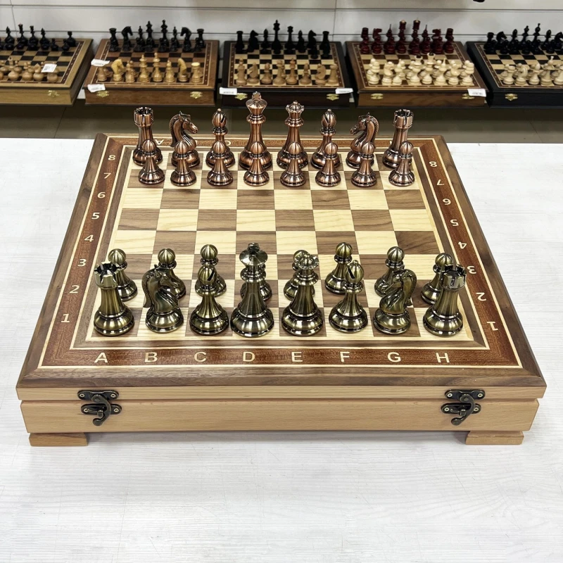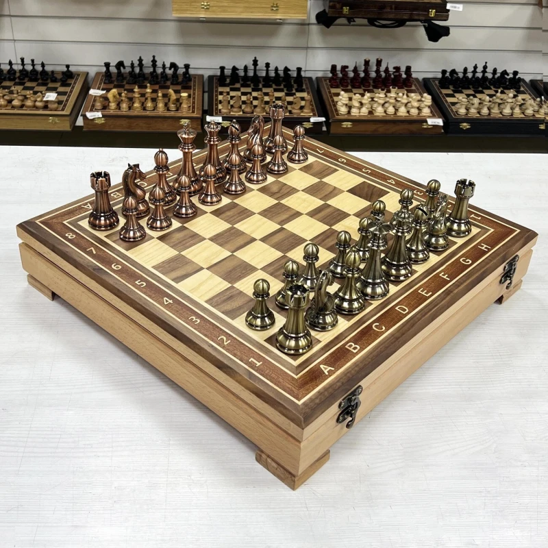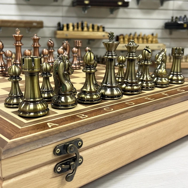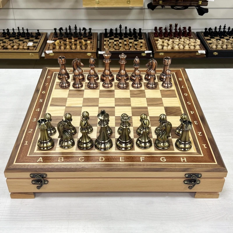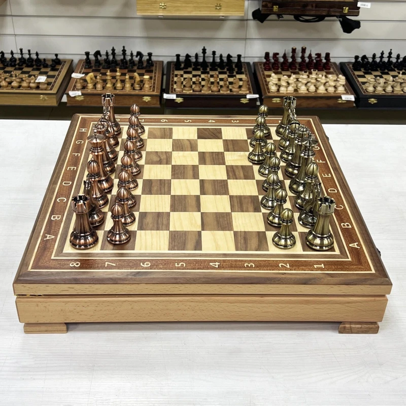 Изысканный шахматный набор с ларцом ручной работы и фигурами из композитного материала с металлическим напылением. Ларец выполненный в технике маркери, который станет настоящим украшением любой коллекции. Размер ларца составляет 52 на 52 см с толщиной 8 см, он создан из массива бука, что обеспечивает прочность и долговечность. Внешняя поверхность украшена изящными вставками из шпона ореха, красного дерева и ясеня, придающими изделию элегантный и современный вид. Внутри ларца расположены аккуратные ячейки для хранения шахматных фигур, что позволяет удобно хранить и транспортировать комплект. Шахматные фигуры из композита. Максимально утяжелены и подклеены у основания для защиты доски. Высота короля -11 см, пешки - 6 см. Этот уникальный комплект сочетает в себе мастерство ручной работы, высокое качество материалов и изысканный дизайн, делая его идеальным подарком или ценным дополнением к интерьеру любителя шахмат.