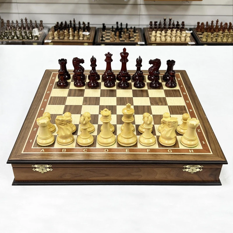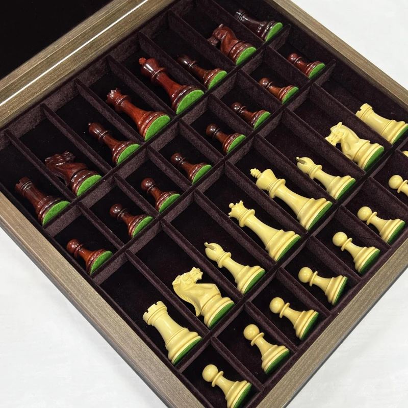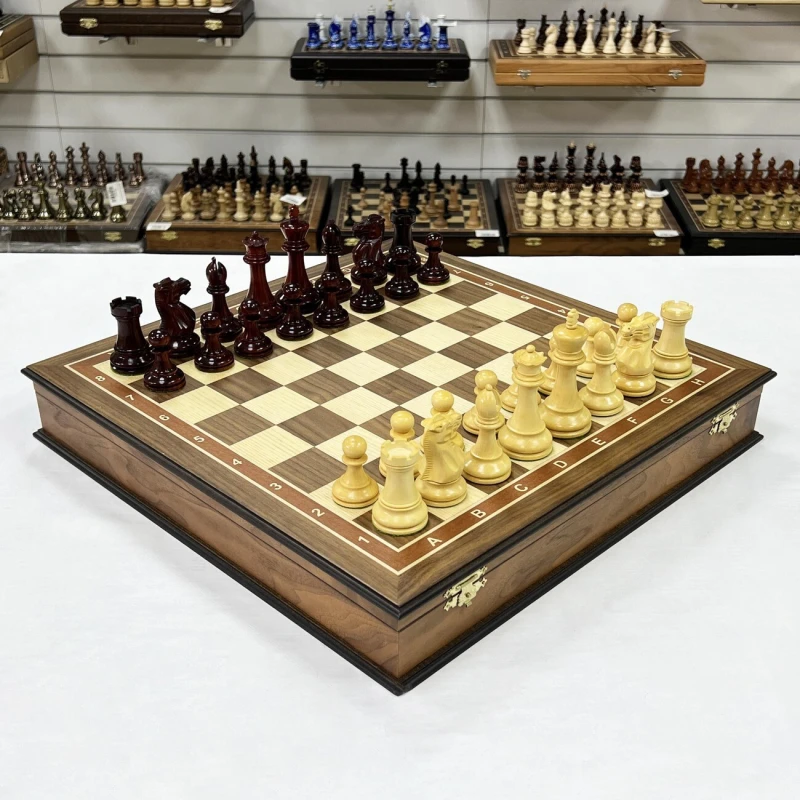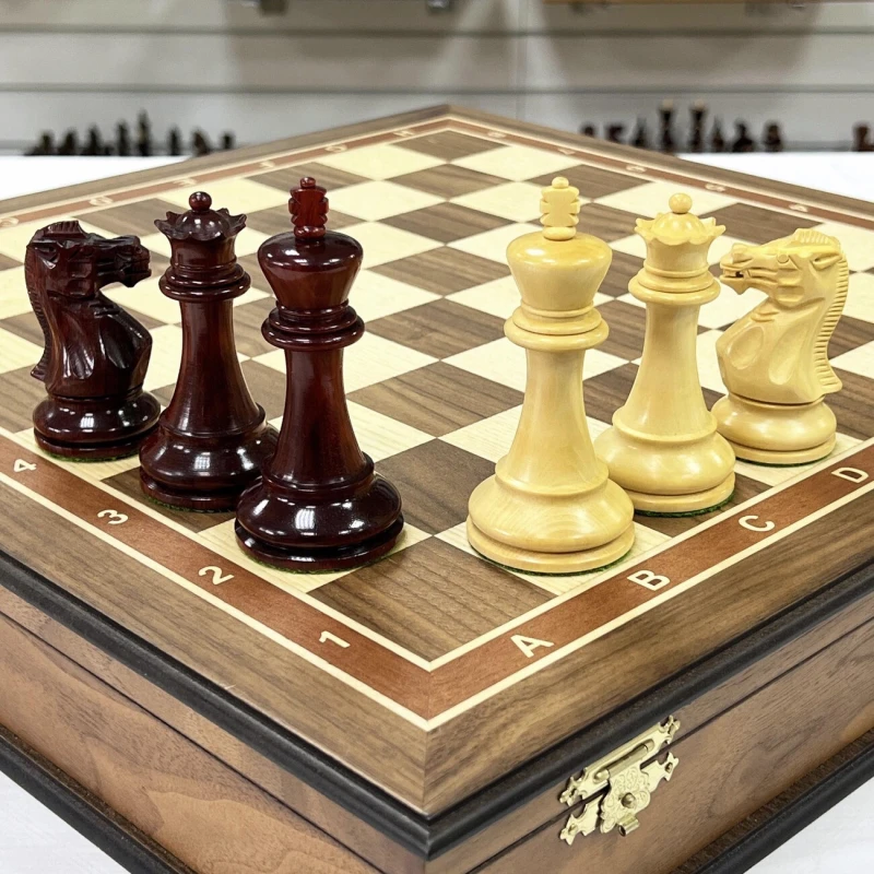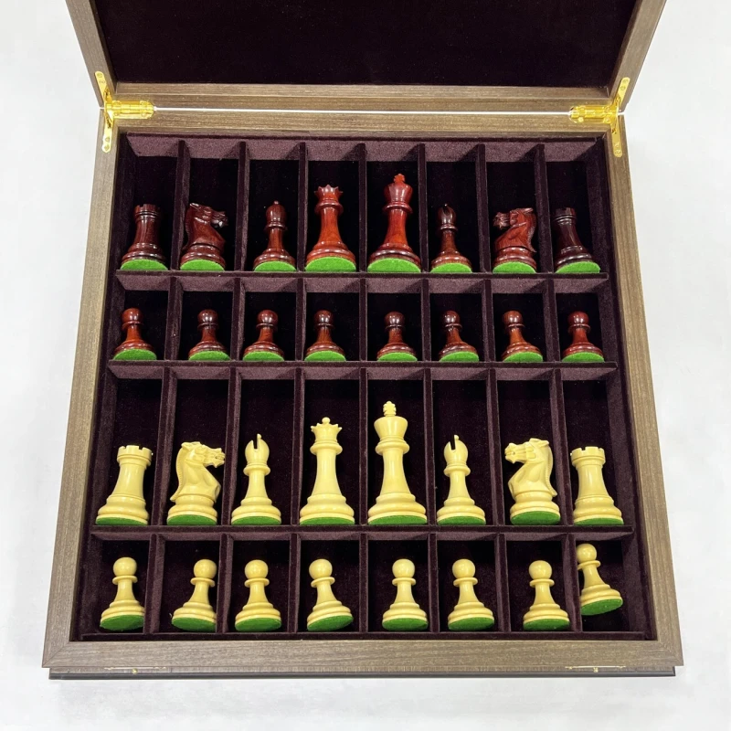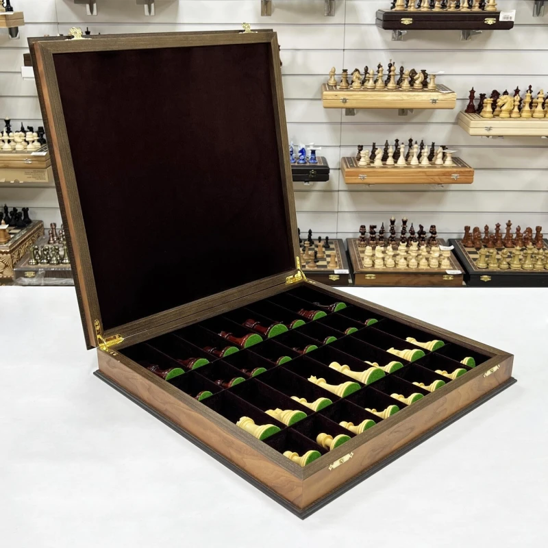Изысканный шахматный набор ручной работы: ларец 45x45 см, выполненный в технике маркетри из шпона ореха и ясеня, внутри - ячейки для фигур с бархатной отделкой. Фигуры ручной работы в стиле Стаунтон из ценных пород дерева: падук и самшит, утяжелены, отполированы вручную и имеют подклейку у основания. Идеальное сочетание роскоши и интеллектуального развлечения!