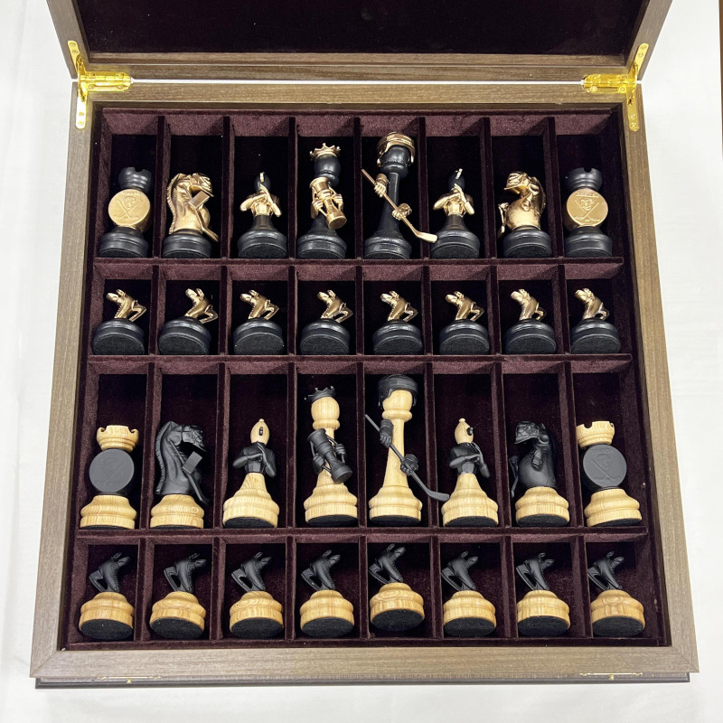 Шахматные фигуры ручной работы в хоккейной тематике выполнены из дерева и отличаются оригинальным дизайном, отражающим страсть к хоккею. Каждая фигура аккуратно подклеена у основания для стабильности и приятного тактильного ощущения во время игры. Эти уникальные фигуры станут ярким дополнением любой шахматной коллекции и подарком для любителей хоккея и шахмат. Размер короля - 11 см, размер пешки- 5 см, Полностью ручная работа. Сделаны в России.