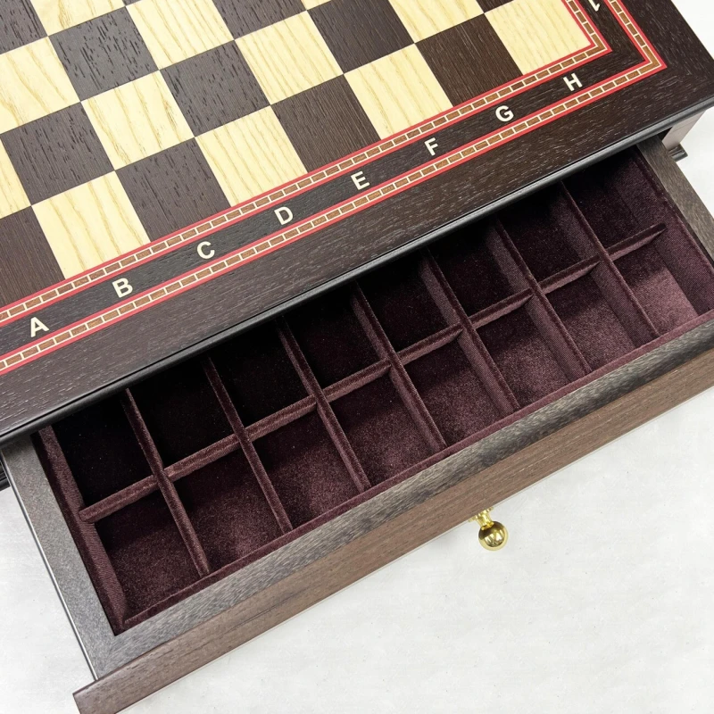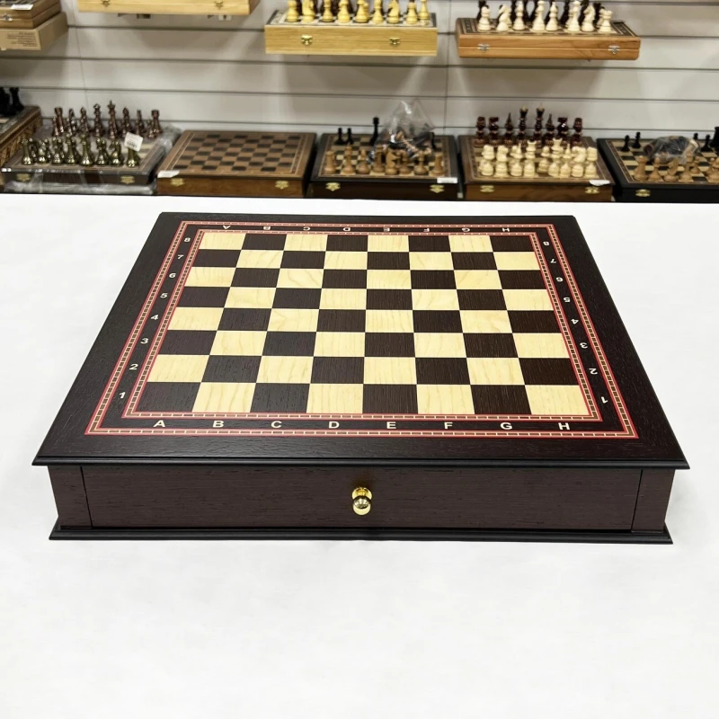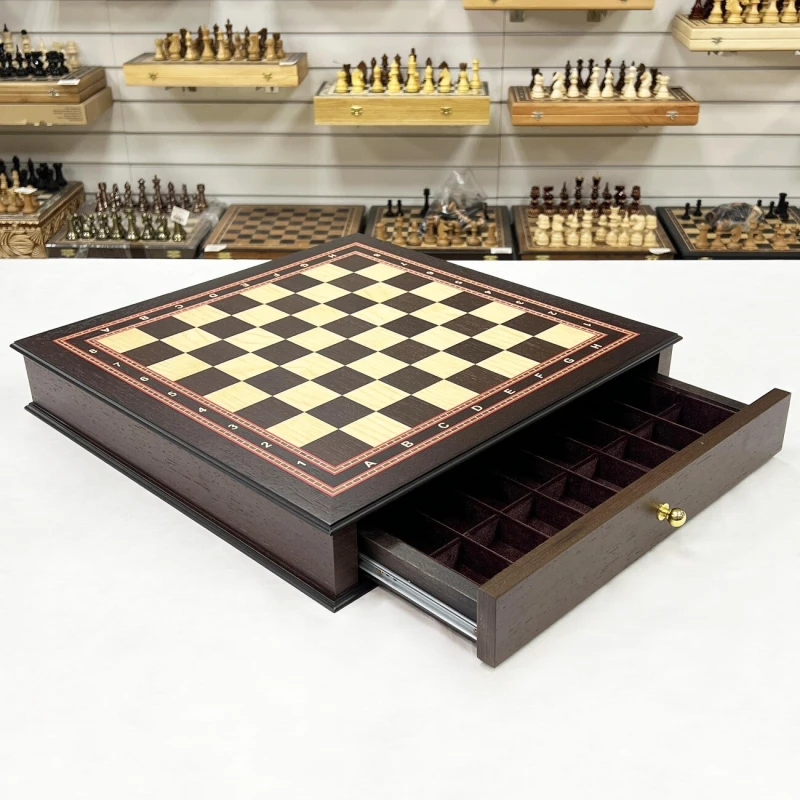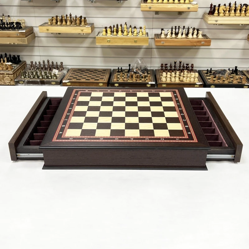 Большая шахматная доска в виде ларца с выдвижными ящиками с двух сторон. Шахматное поле собирается в технике маркетри из ценных и дорогих пород дерева. Темная клетка венге, светлая клетка ясень. Размер клетки 5 на 5 см. Размер доски 48 на 48 см. Сделан в России. Упакован в транспортировочную коробку. Подойдут для фигур с высотой короля до 10 см и высотой пешки до 5 см.