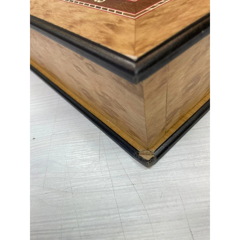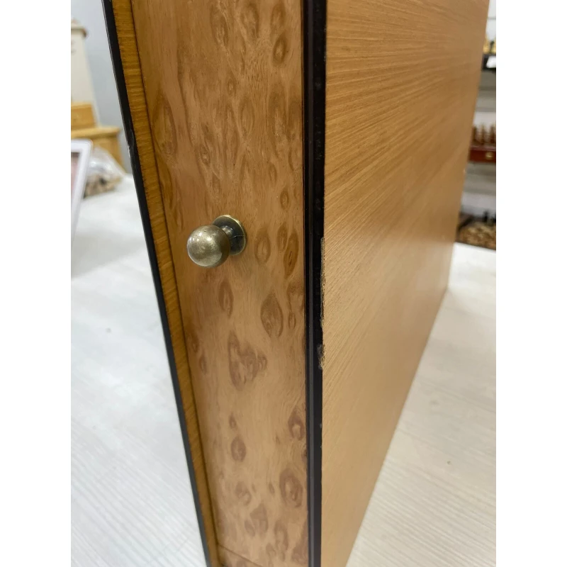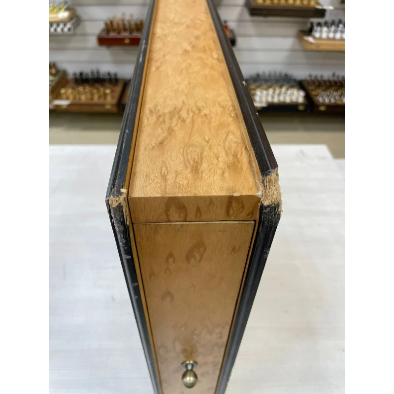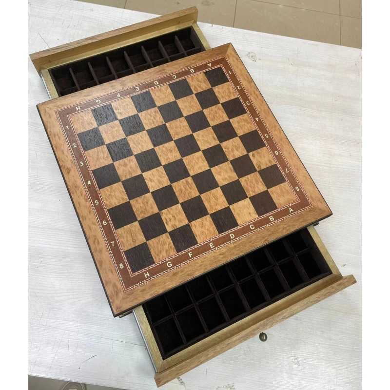 Размер доски 47х47 см, а размер клетки 4.5 см. В основании ларца выдвижные ящики для хранения фигур