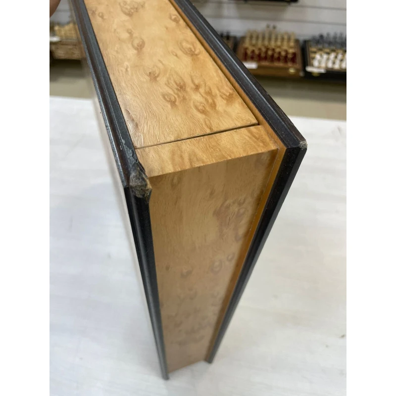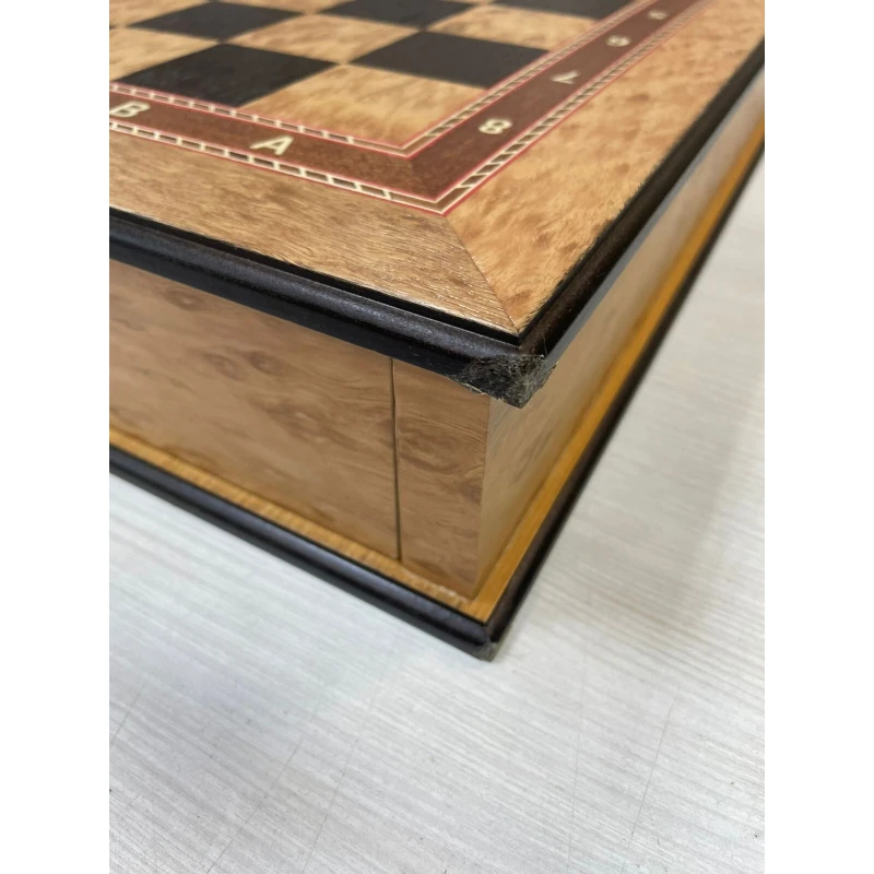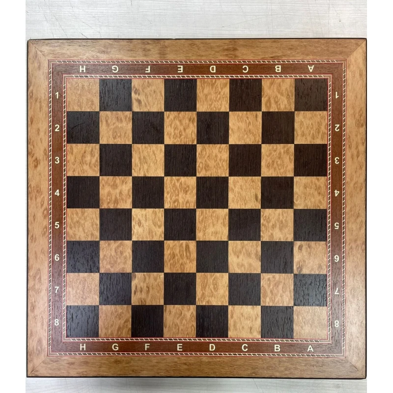 Шахматная доска – основа для игры в шахматы. Каркас данной модели доски выполнен из березы, а ее игровое поле покрыто шпоном различных ценных пород дерева, (эвкалипт, венге, и прочее). Никакой цветной печати - каждый элемент доски, будь то клетка, цифры или буквы, а также поля доски выполнены из дерева.
