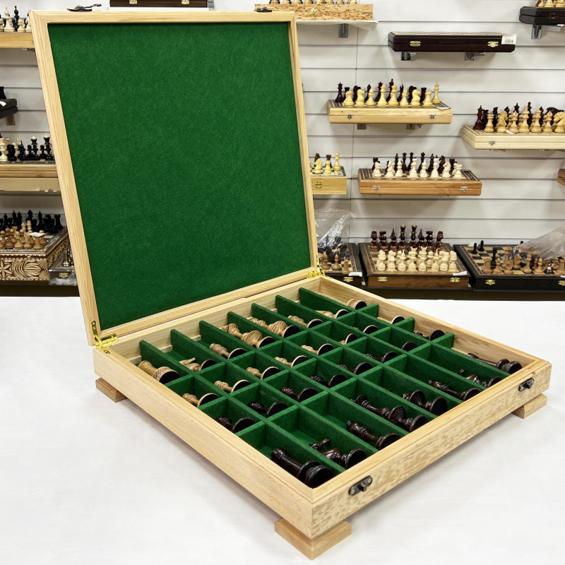 Это изысканный шахматный набор ручной работы. Шахматный ларец выполненный в технике маркерри, который станет настоящим украшением любой коллекции. Размер ларца составляет 52 на 52 см с толщиной 8 см, он создан из массива бука, что обеспечивает прочность и долговечность. Внешняя поверхность украшена изящными вставками из шпона венге и ясеня, придающими изделию элегантный и современный вид. Внутри ларца расположены аккуратные ячейки для хранения шахматных фигур. Шахматные фигуры из массива ясеня для больших досок с клеткой от 5 см. Высота короля 14 см, высота пешки 7 см. Фигуры достаточно изящные с хорошей детализацией. Сделано в России.