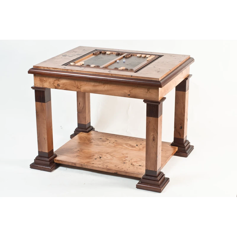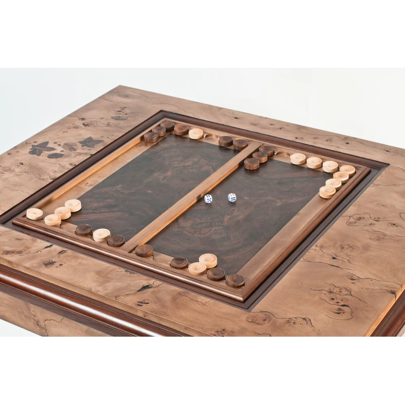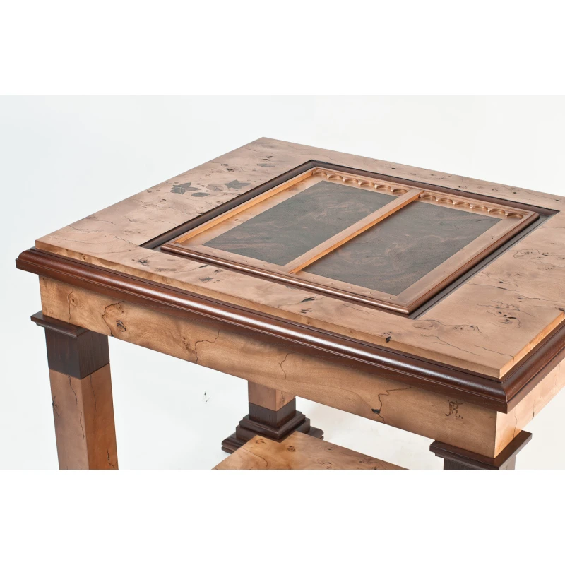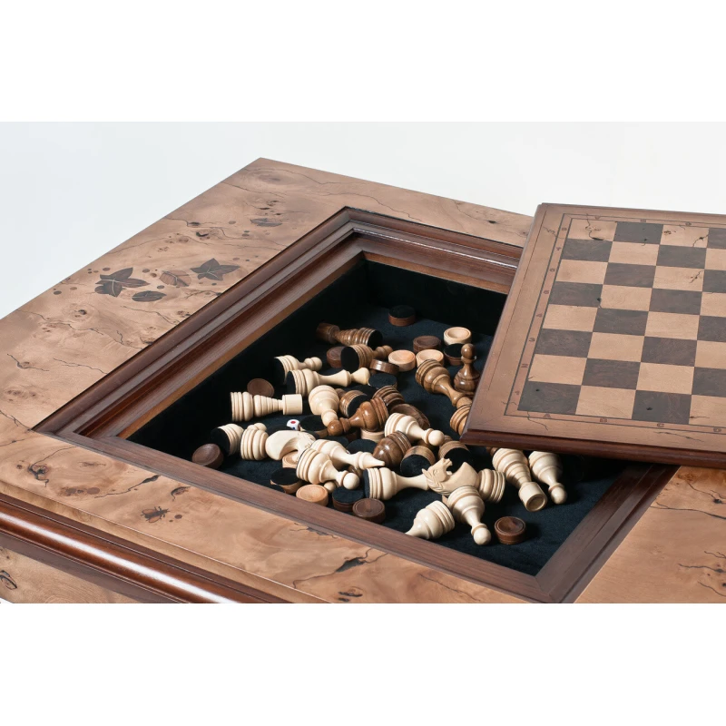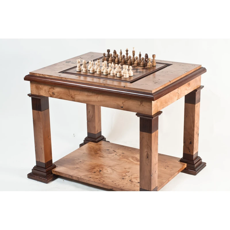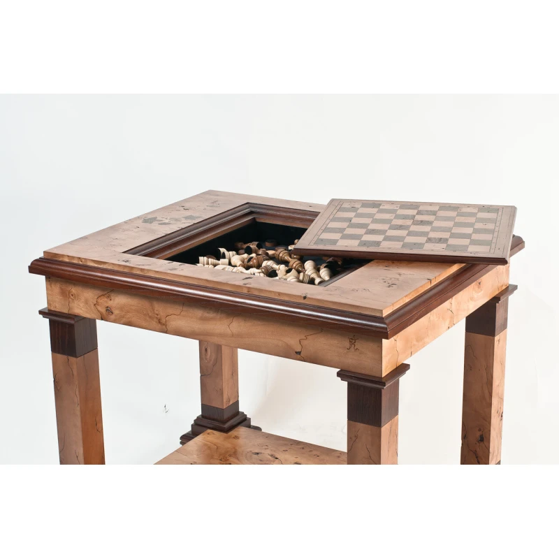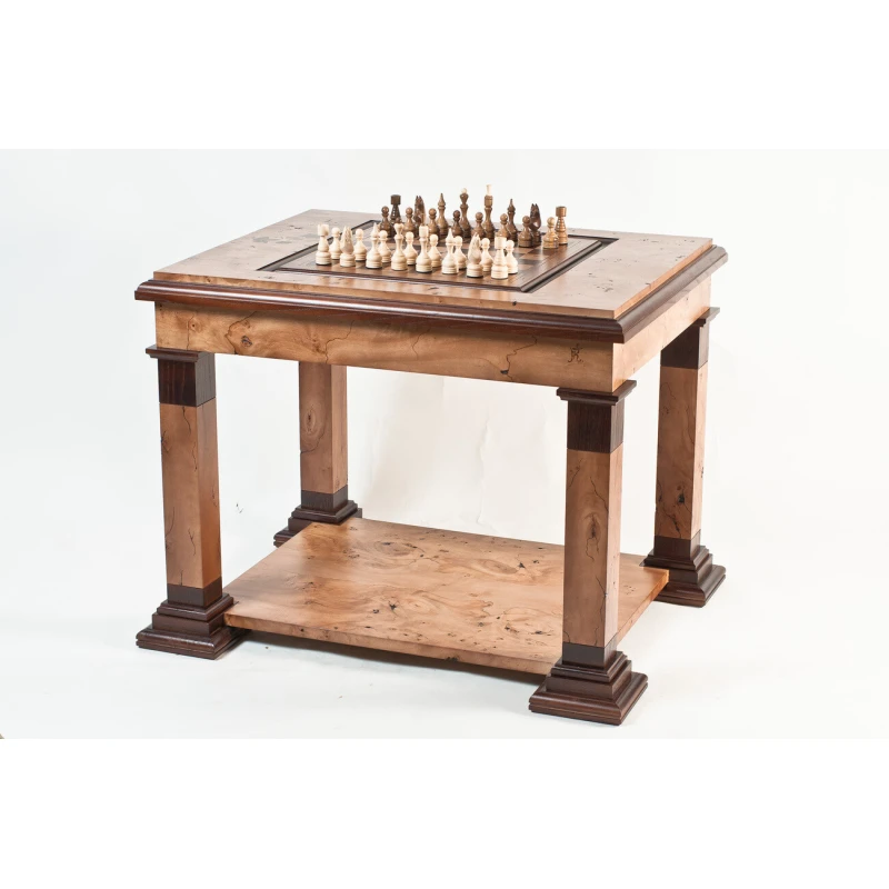 Шахматный стол изготовлен из ясеня, шпон - кап тополя. Добавляются небольшие фрагменты маркетри листьев. Покрыт полиуретановым лаком. Коробка внутри стола в бархате. Стол разборный.