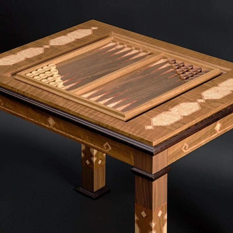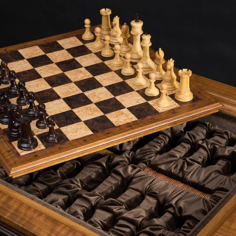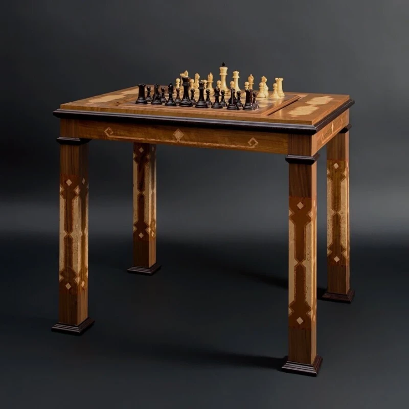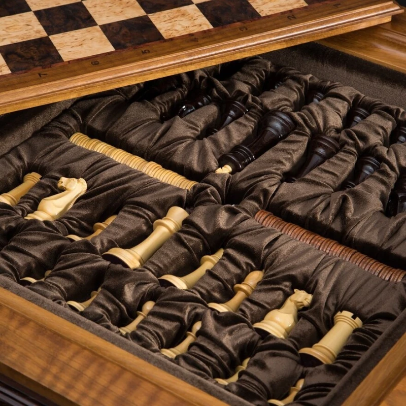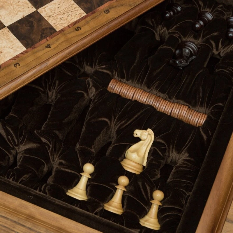 Предназначен для игры в шахматы или нарды, комплекты фигур и шашек расположены внутри в мягком ложементе.