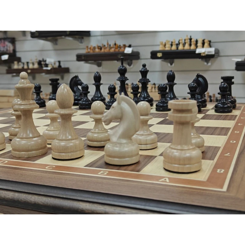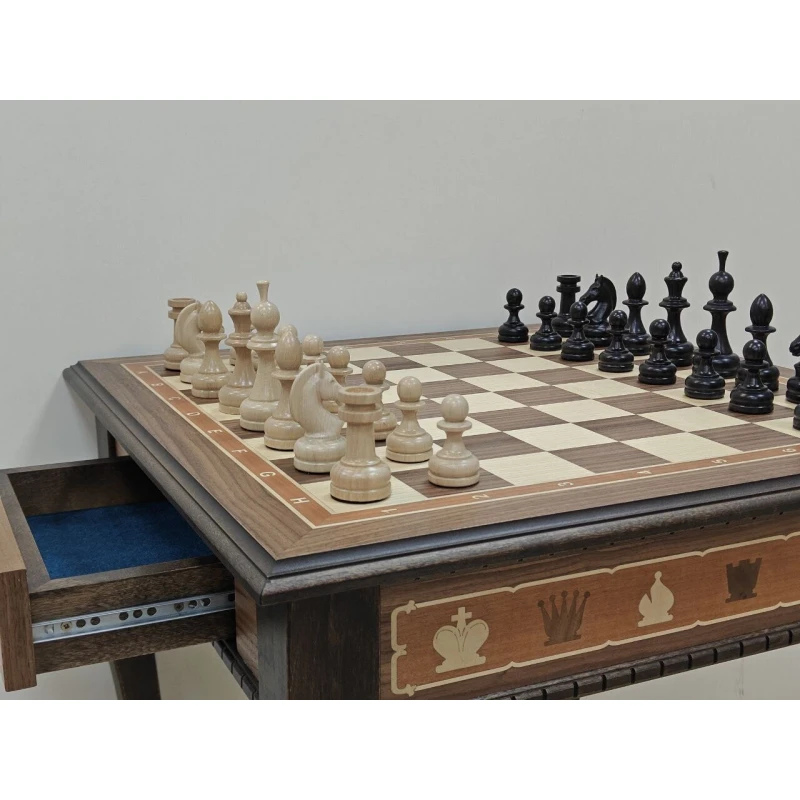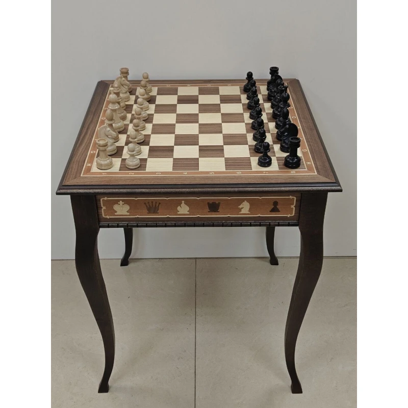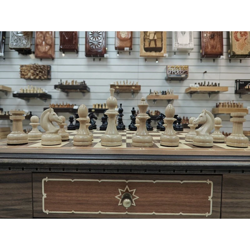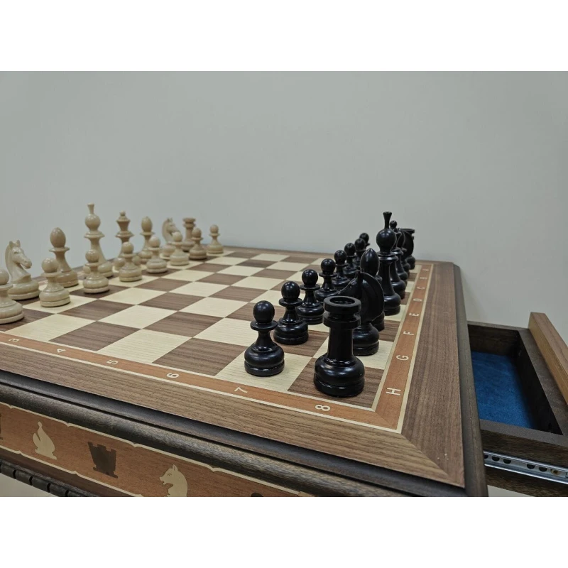 Большой классический шахматный стол из ценных пород дерева. Ручная работа. Размер столешницы 56 на 56 см, клетка 5.5 на 5.5 см. Высота стола 65 см. Шахматные фигуры можно хранить в выдвижных ящиках с двух сторон. Шахматное поле собирается в технике маркетри. Темная часть это орех, светлая клетка ясень. Ноги стола сделаны из массива тонированной березы. Сделан в Росси. Поставляется в разобранном виде, ножки отдельно столешница отдельно, но собирается достаточно просто, нужно прикрутить ноги (крепления в комплекте) и стол будет готов к шахматным баталиям. Так же отлично подойдет в подарок настоящим ценителям шахмат, либо для обучения детей.