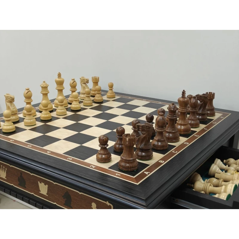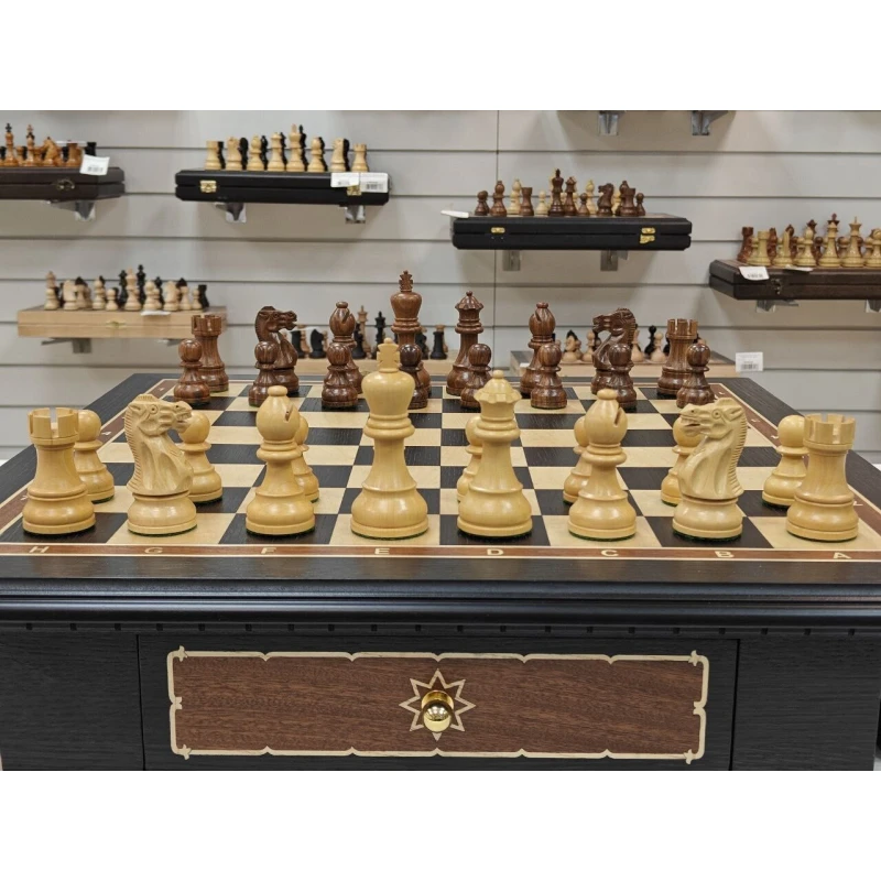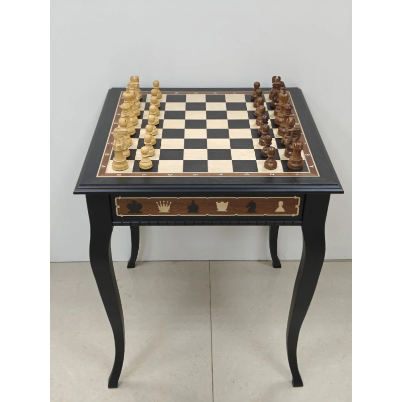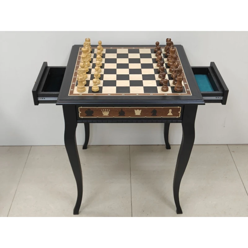 Классический шахматный стол ручной работы из ценных пород дерева. Размер столешницы 56 на 56 см. Высота стола 65 см. Шахматные фигуры с утяжелением в стиле Стаунтон. Поле собирается в технике маркетри. Фигуры хранятся в выдвижных ящиках с двух сторон.