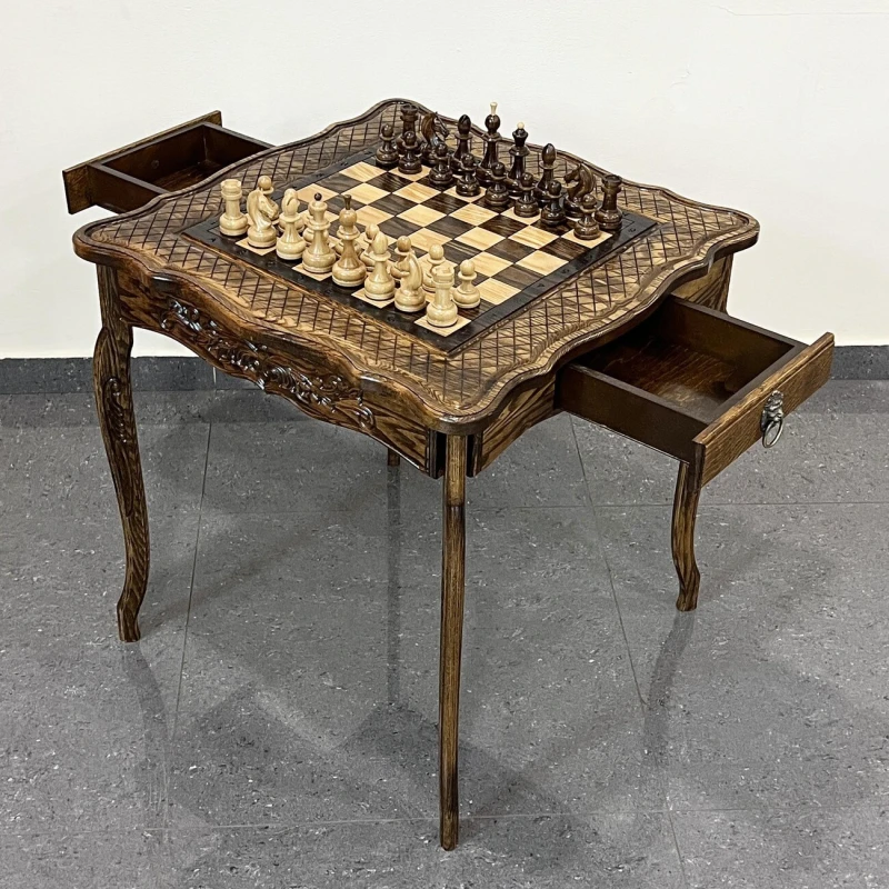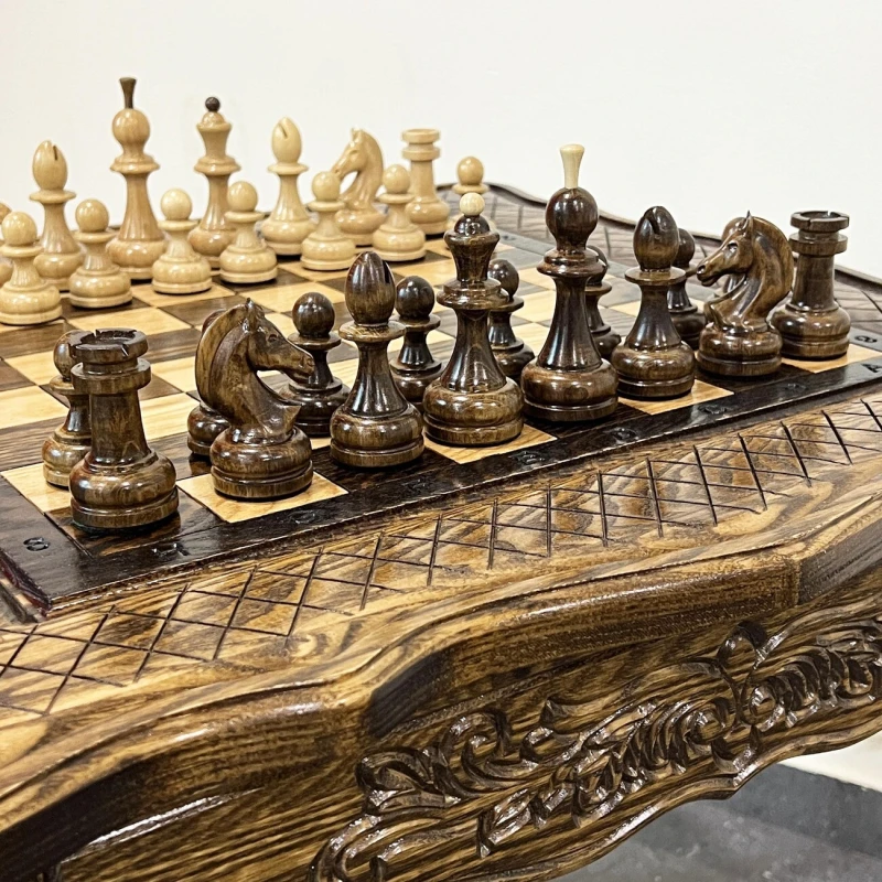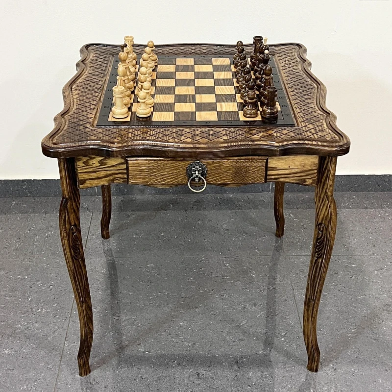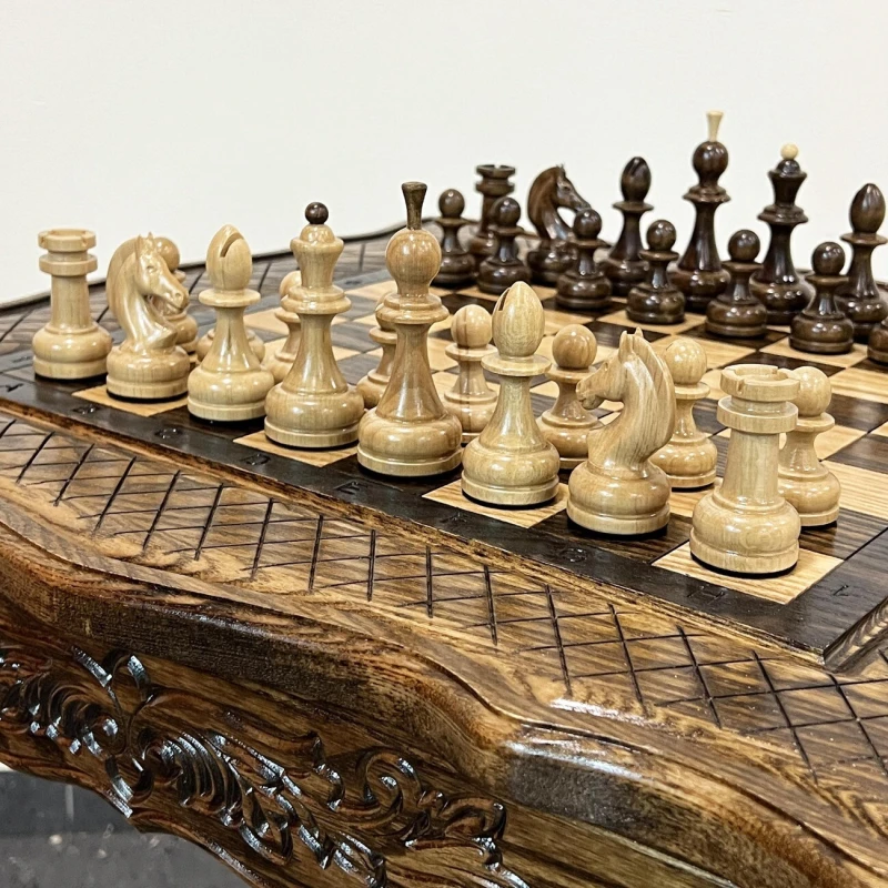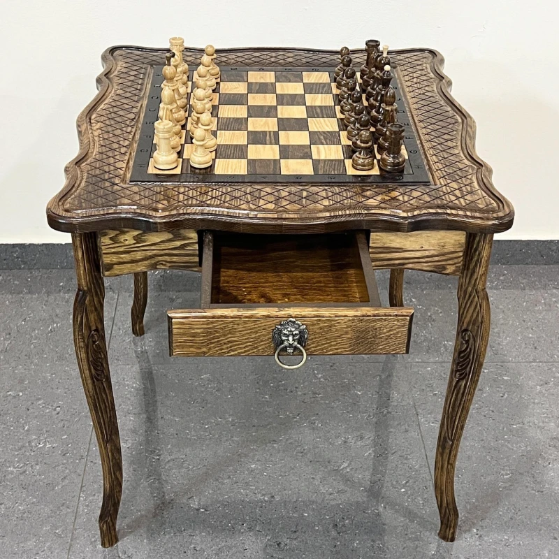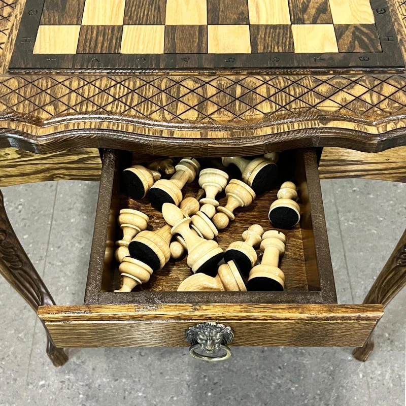 Деревянный шахматный набор ручной работы из ясеня. Размер стола: высота стола 60 см. Размер доски 58 на 58 см. Размер шахматного поля 40 на 40 см. По бокам находится 2 выдвижных ящика для хранения фигур. В комплекте идут классические шахматные фигуры с красивым резным конем. Высота короля 10 см, высота пешки 5 см. Материал шахматных фигур Кавказский граб, покрыты глянцевым лаком. Сделаны в России. Шахматные фигуры близки по стилю Стаунтон, но имеют свою уникальные особенности.