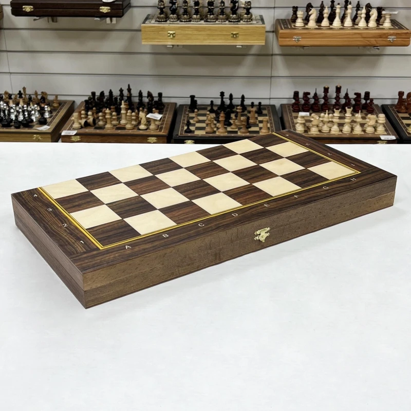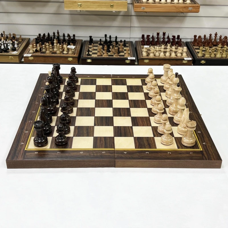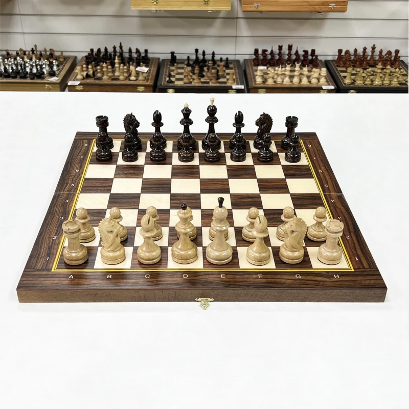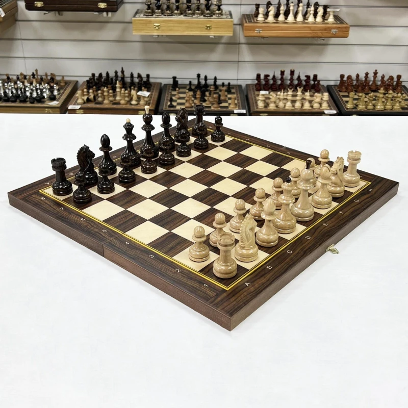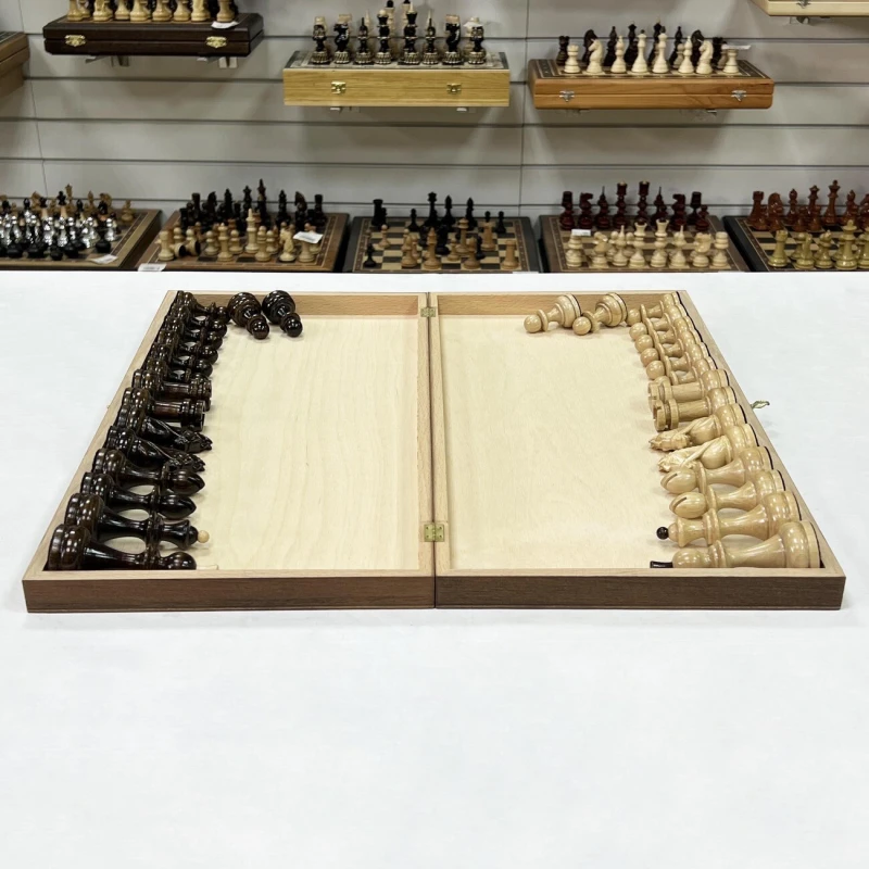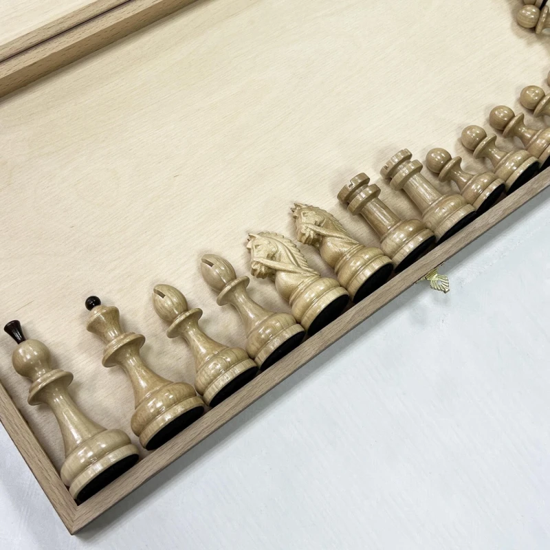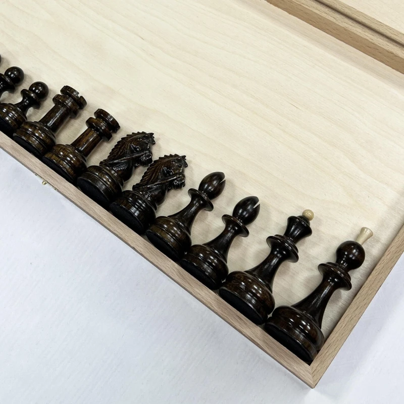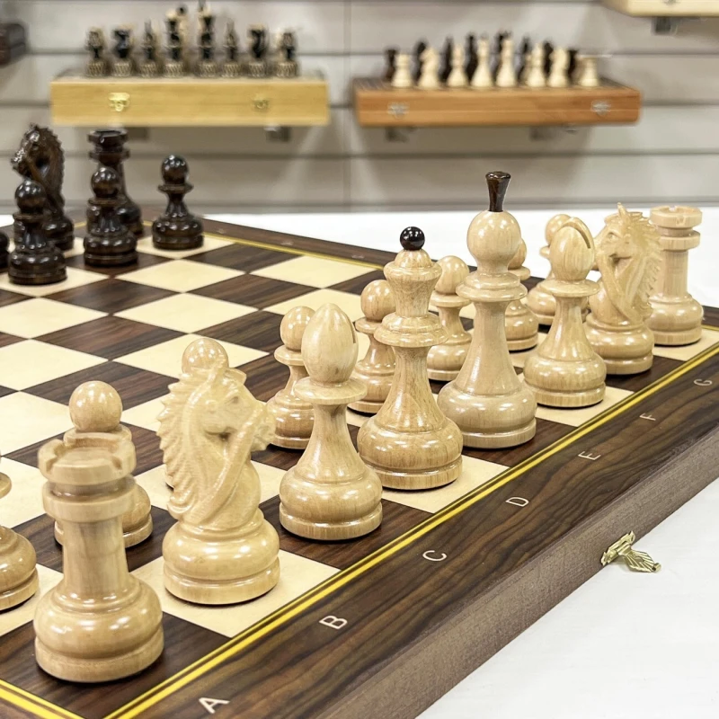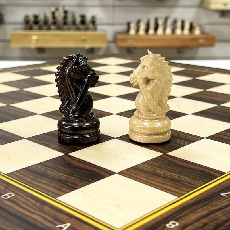 Большой набор шахмат с красивым резным конем и утяжеленными фигурами из дерева. Размер доски в разложенном виде 50 на 50 см. Шахматы достаточно габаритные, то нужно учитывать. Доска складного типа, что позволяет их удобно хранить в любом пространстве. Шахматные фигуры вырезаются в ручную и покрыты глянцевым лаком. Хорошие турнирные шахматы при этом с необычным внешним видов подойдут в подарок и для детей и для взрослых. Сделаны в России.