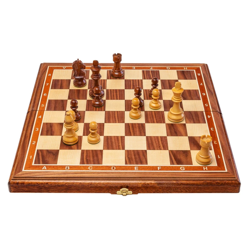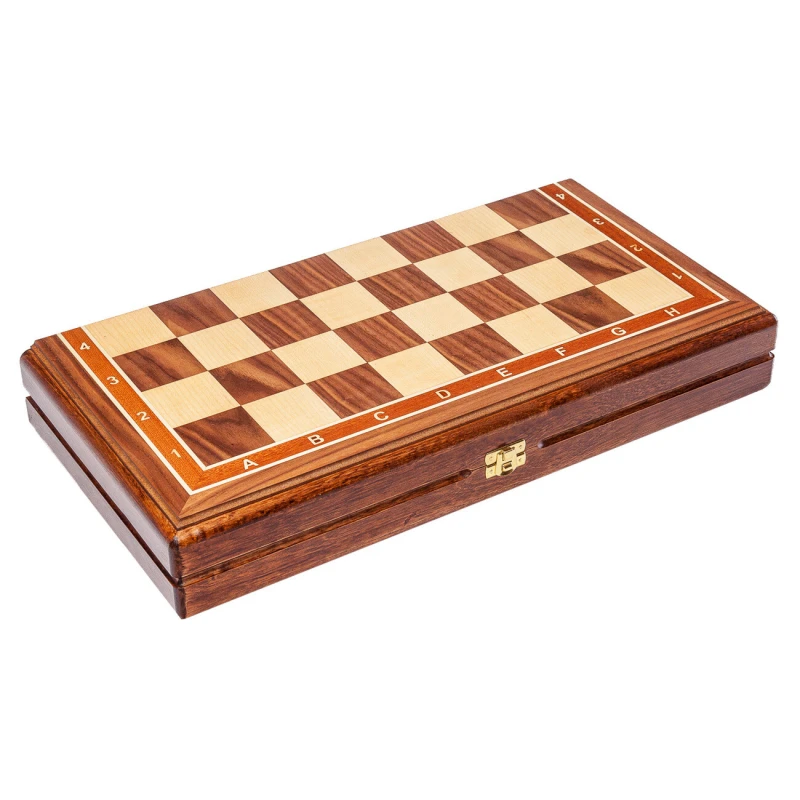 Шахматная доска – основа для игры в шахматы. Каркас данной модели доски выполнен из бука, а ее игровое поле покрыто шпоном различных ценных пород дерева, (орех, светлый ясень, и прочее). Никакой цветной печати - каждый элемент доски, будь то клетка, цифры или буквы, а также поля доски выполнены из дерева.