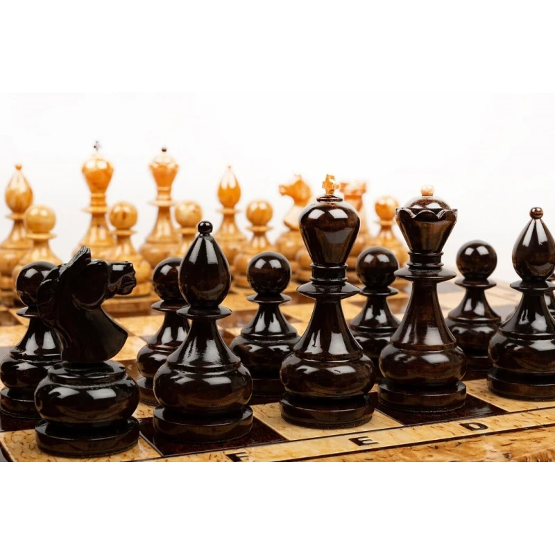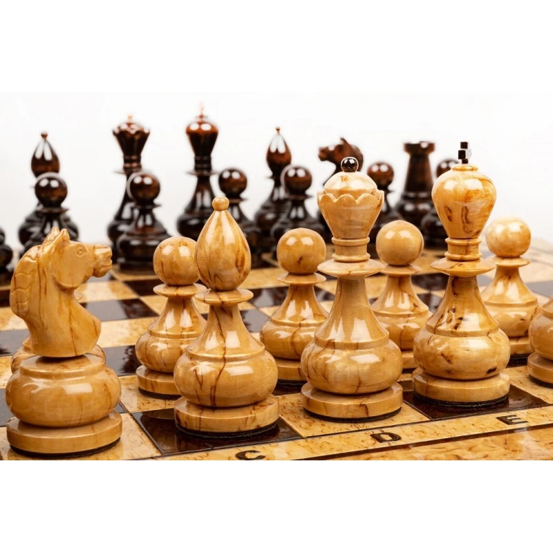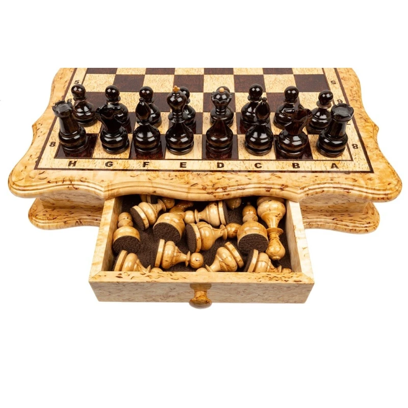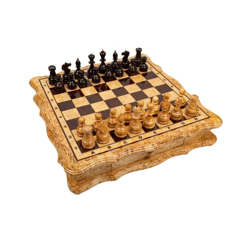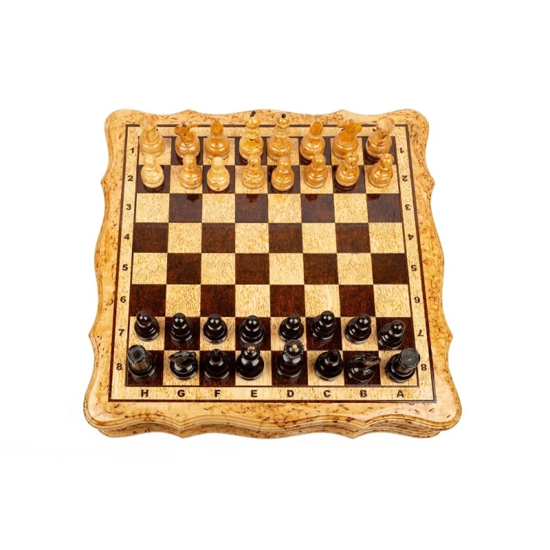 Эксклюзивные шахматы из карельской березы. Шахматы на доске филигранной формы. В комплекте шахматные фигуры из карельской березы. Размер доски 42 на 42 см.
