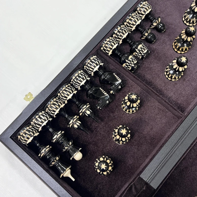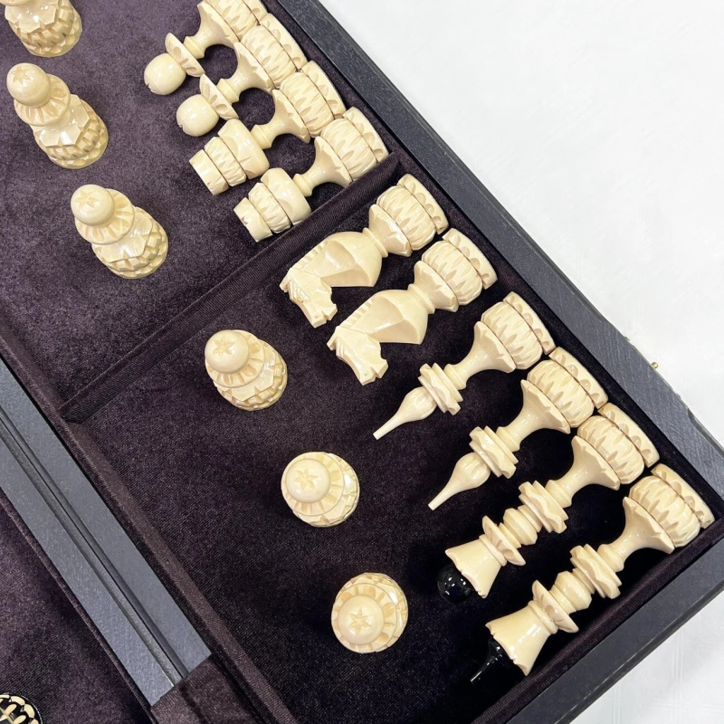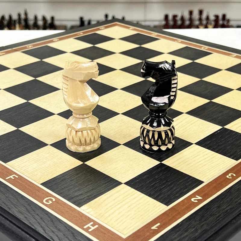 Большие шахматы ручной работы. Размер доски в разложенном виде 50 на 50 см. Шахматное поле собирается в технике маркетри из ценных пород дерева, темная клетка моренный дуб, светлая клетка ясень. Размер клетки 5 на 5 см. Шахматные фигуры сделаны из липы классической формы, но с большим количеством резных элементов. Высота короля 12.6 см, фигуры без утяжеления, но при этом достаточно устойчивые на доске. Сделаны в России.