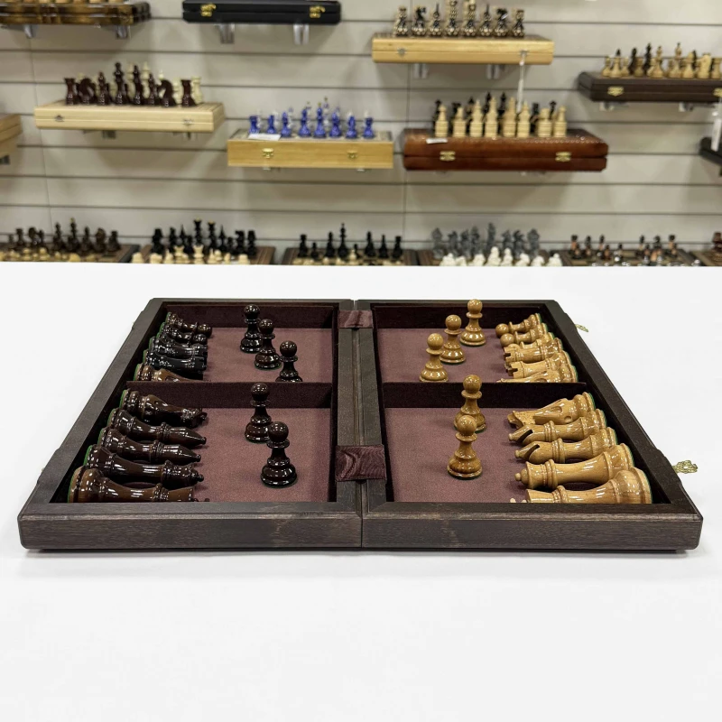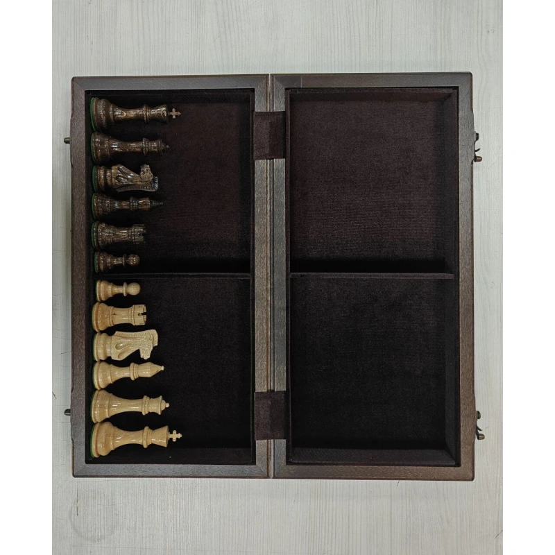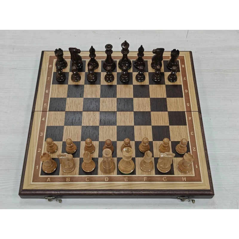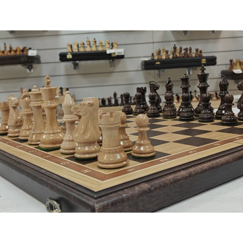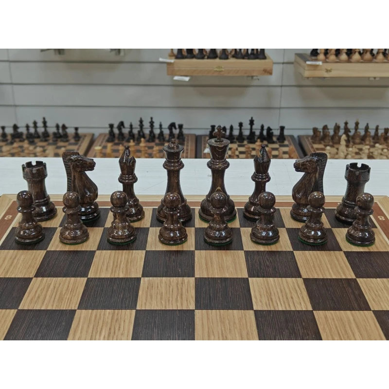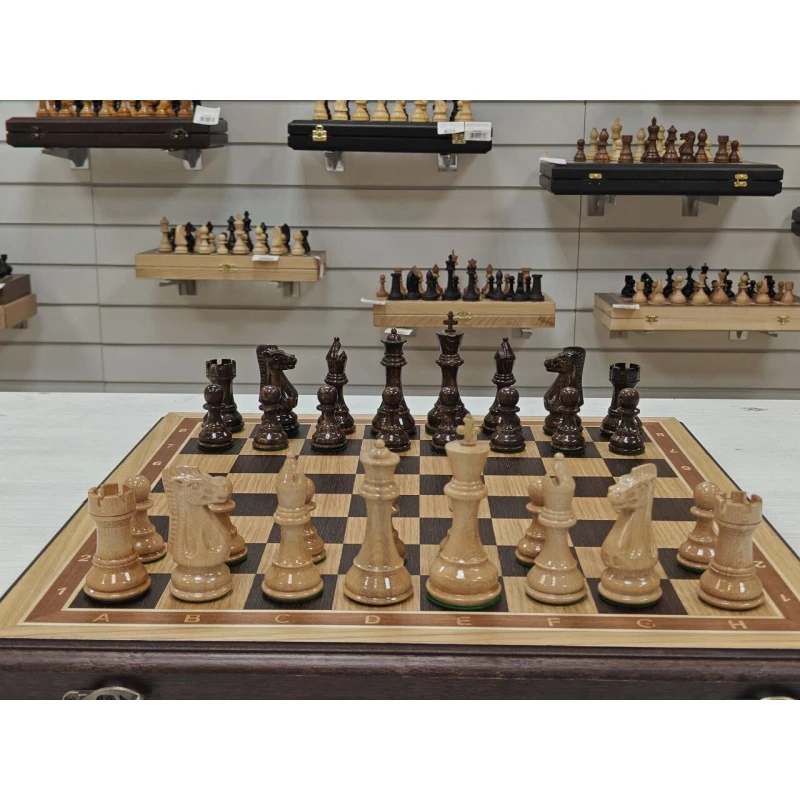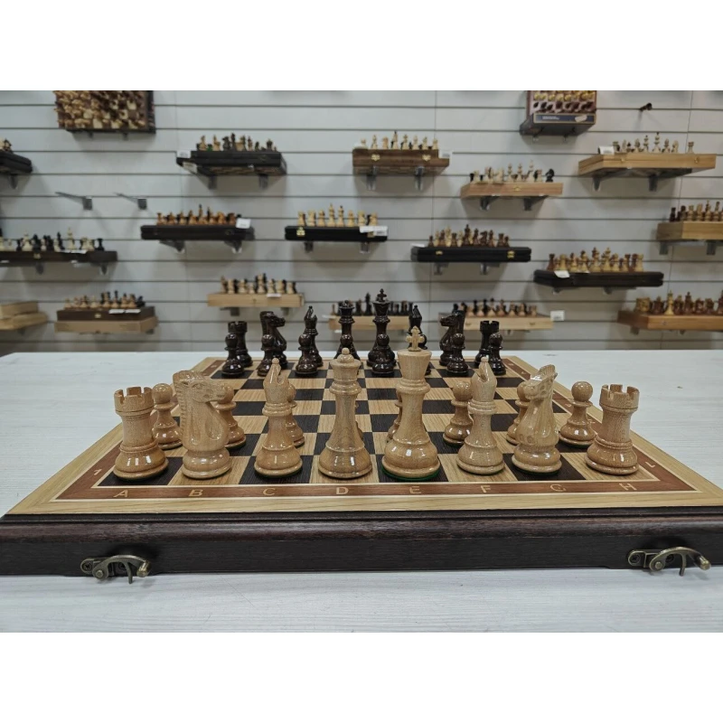 Эксклюзивные шахматы из ценных пород дерева ручной работы. Фигуры изготовлены из дуба и покрыты лаком, доска выполнена из черного дерева и дуба. Фигуры великолепно сочетаются с доской размером и внешним видом. Размер клетки 4.5х4.5см, высота короля 10см пешка 5см