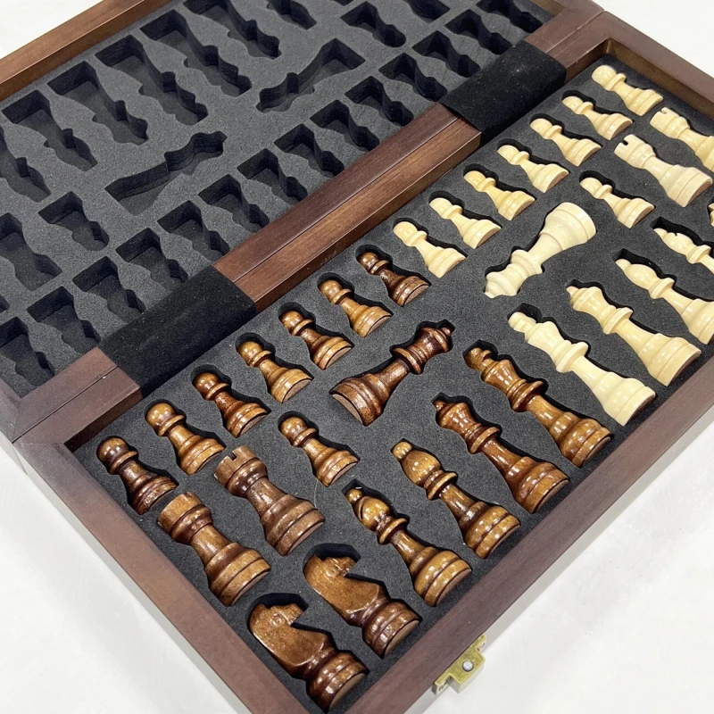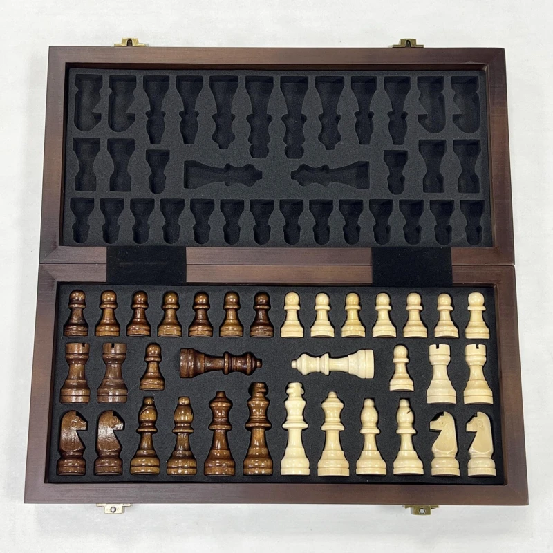 Деревянные шахматы с ячейками для бережного хранения фигур. Размер доски в разложенном виде 30 на 30 см. Высота короля 5.6 см. Материал фигур дерево, материал доски дерево. Упакованы в транспортировочную коробку.