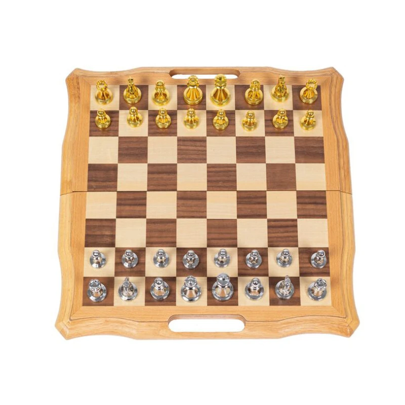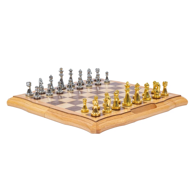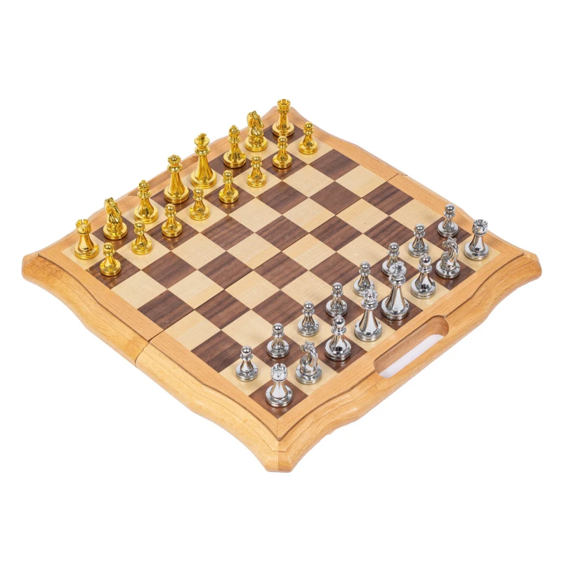Подарочные шахматы из металла на деревянной доске ручной работы. Внутри доски есть ячейки для хранения фигур. В наборе доп ферзи. Высота короля 6.5 см, высота пешки 3.5 см. Материал доски бук, орех и клен. Подойдут в подарок для детей и взрослых.