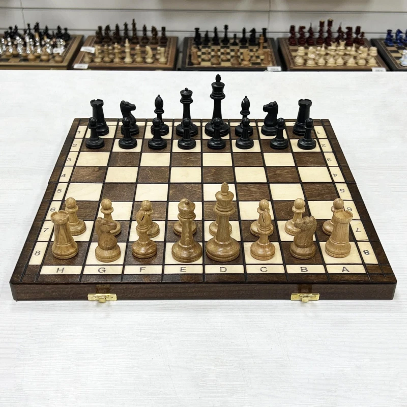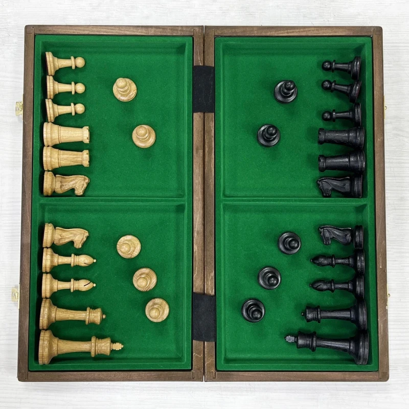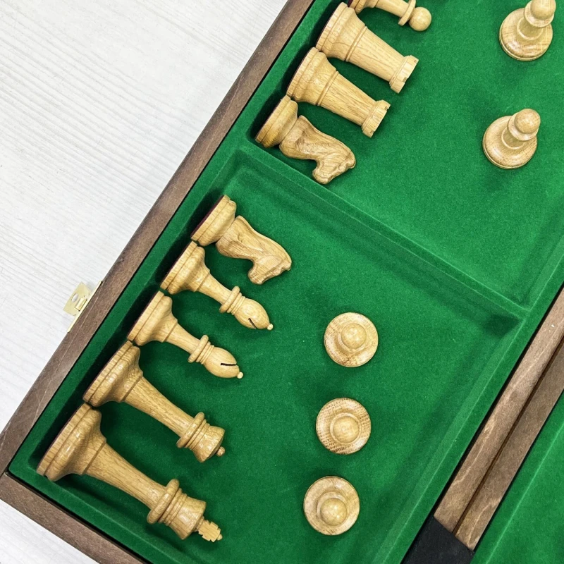 Турнирные шахматы ручной работы с классическими фигурами Стаунтон из дуба. Размер доски в разложенном виде 40 на 40 см. Шахматная разметка делается с помощью выжигания по дереву. Внутри 2 отсека для хранения фигур. Шахматные фигуры с утяжелением. Подойдут в подарок для детей и взрослых.