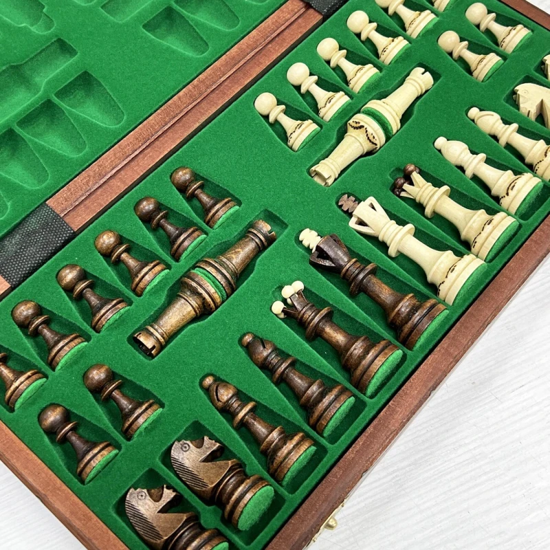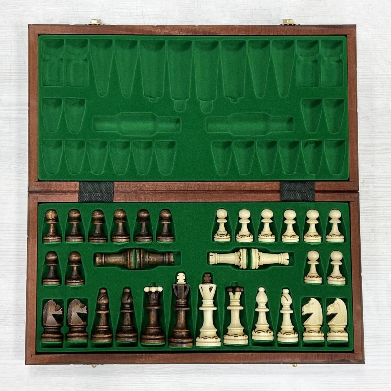 Необычные подарочные шахматы из дерева для детей и взрослых. Внутри доски есть ячейки для хранения фигур. Материал доски и фигур дерево. Размер доски в разложенном виде 40 на 40 см, высота короля 8.9 см, высота пешки 4 см. Размер клетки 4 на 4 см. Шахматное поле украшено декоративными элементами с помощью выжигания. Сделаны в Польше. Подойдут в подарок. Упакованы в коробку.