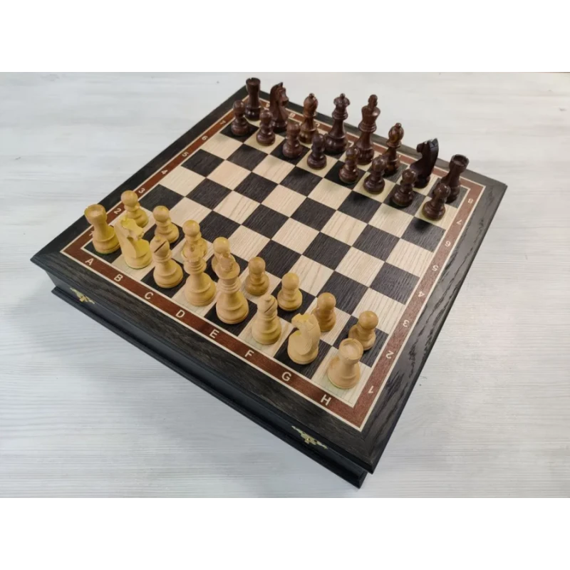 Подарочные шахматы ручной работы. Внутри доски есть ячейки для хранения фигур. Высота короля 9.5 см. Высота пешки 4.7 см. Фигуры с подклейкой. Материал доски мореный дуб. Материал светлых фигур самшит, материал темных фигур палисандр. Шахматное поле сделано в технике маркетри. Темная клетка мореный дуб, светлая клетка ясень. Ячейки внутри покрыты бархатом. Шахматные фигуры в классическом стиле Стаунтон. Идеально подойдут в подарок для взрослых и детей. Фигуры без утяжеление, но при этом достаточно устойчивые.