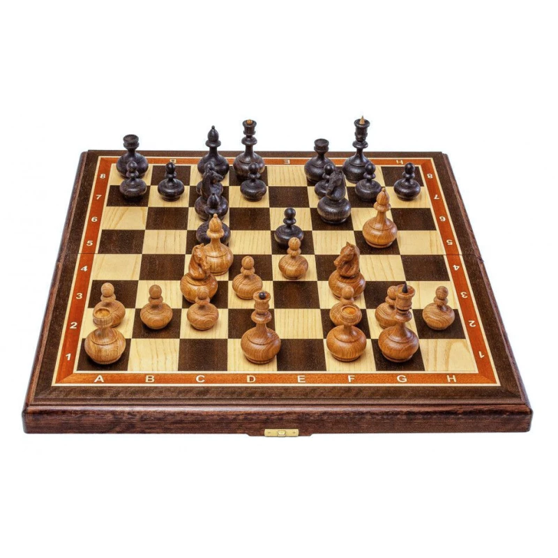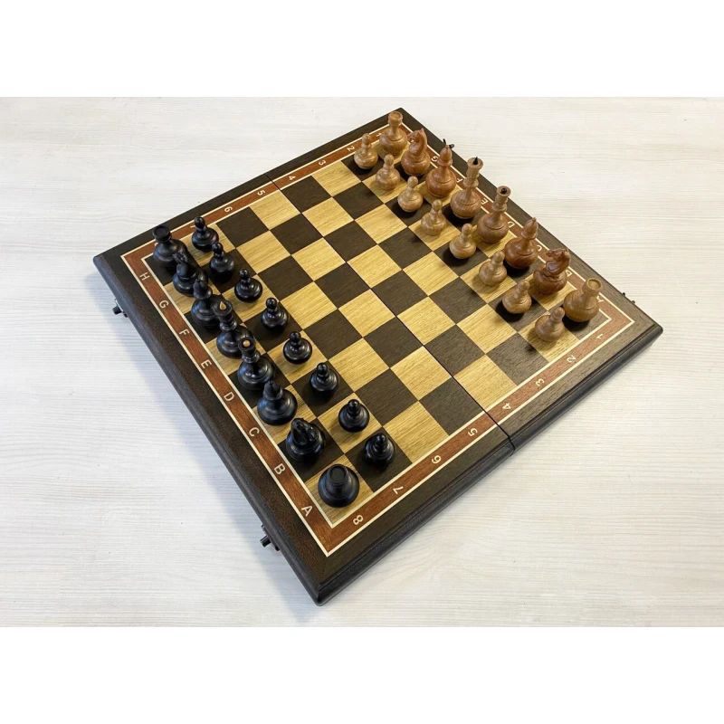 Шахматная доска – основа для игры в шахматы. Каркас данной модели доски выполнен из бука, а ее игровое поле покрыто шпоном различных ценных пород дерева, (Венге, светлый ясень, и прочее). Никакой цветной печати - каждый элемент доски, будь то клетка, цифры или буквы, а также поля доски выполнены из дерева.
