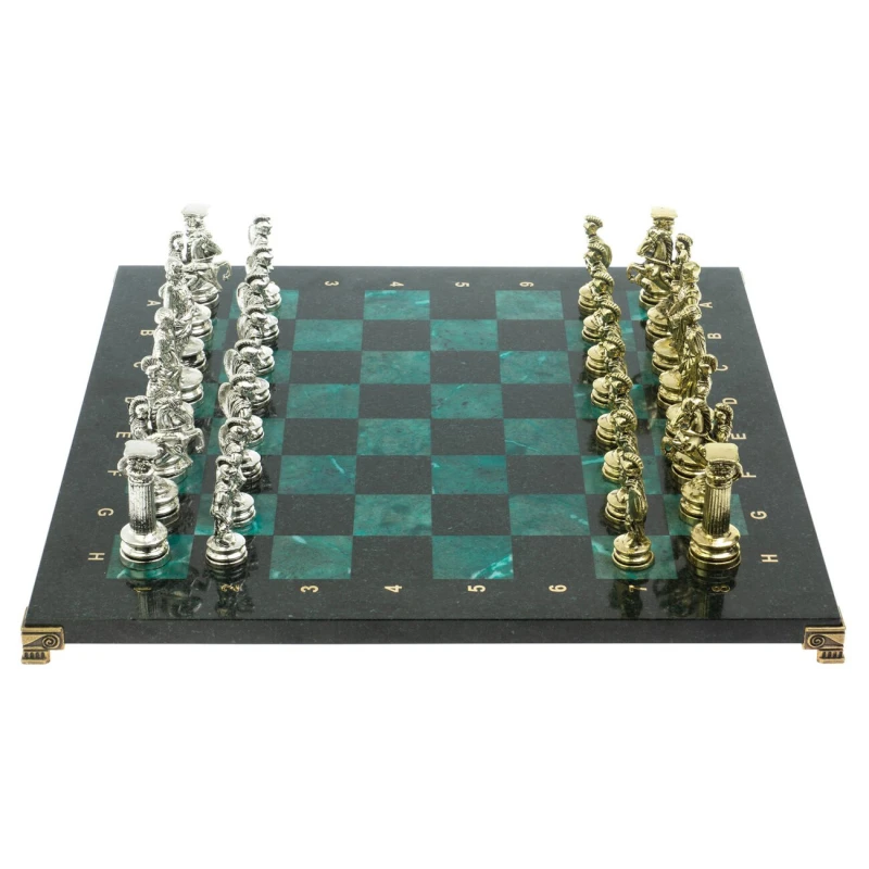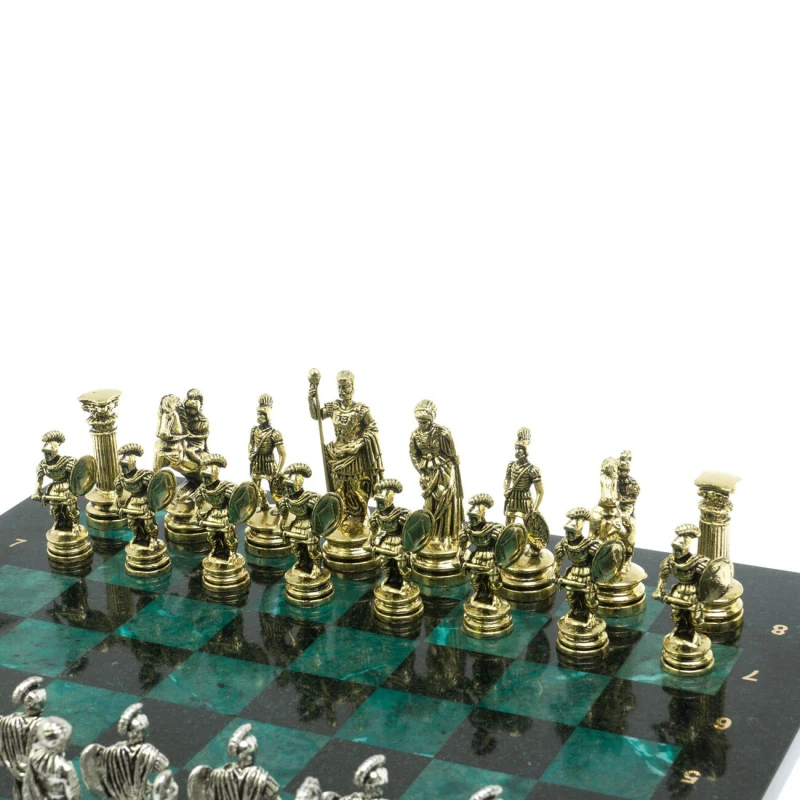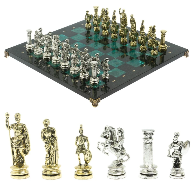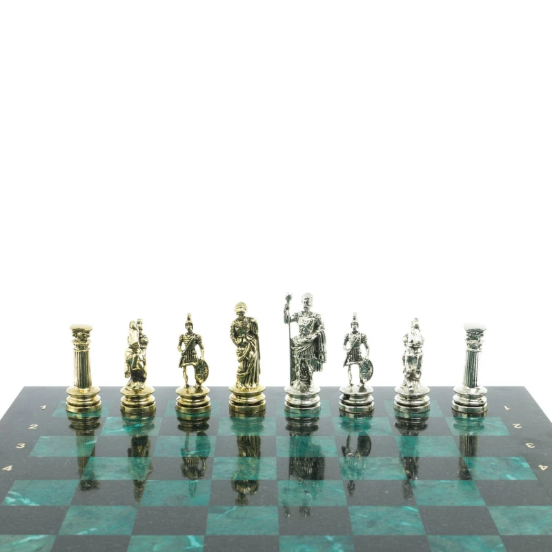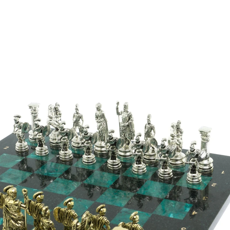 Набор для игры в шахматы "Древний Рим" изготовлен вручную, доска из натурального камня, шахматные фигуры металлические в цвете золото и серебро.