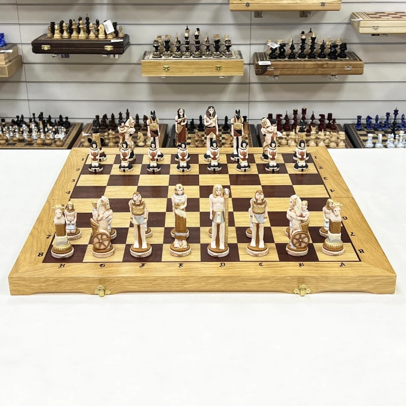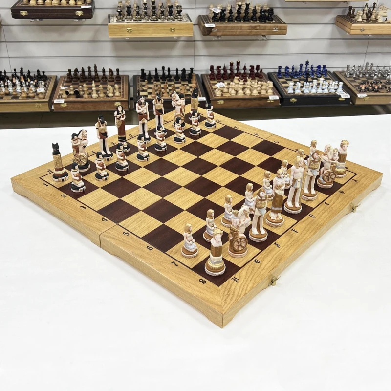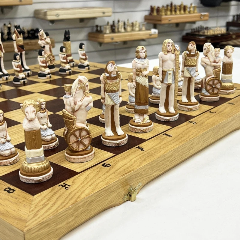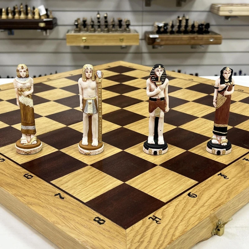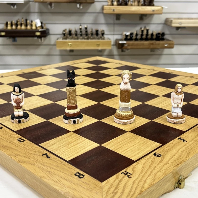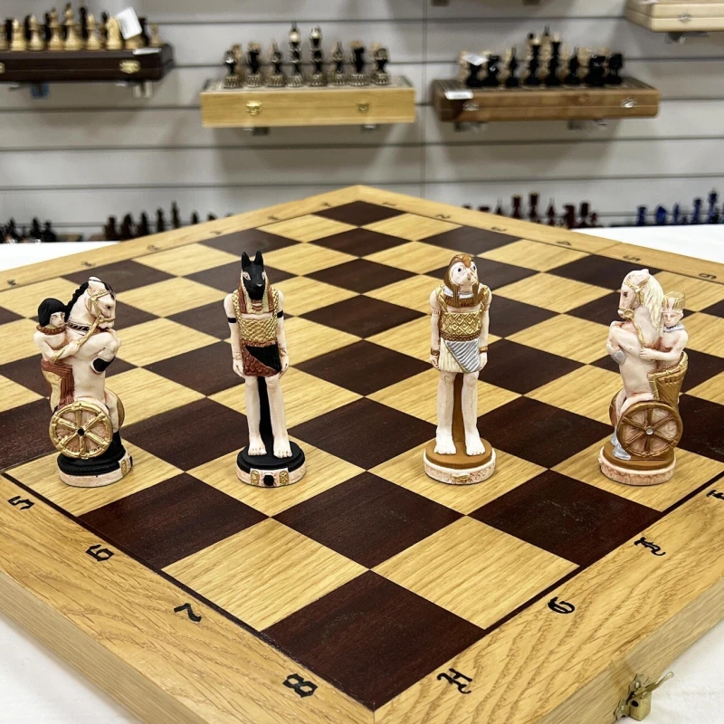 Обычными, классическими шахматными досками мало кого удивишь, что и стало стимулом для польского производителя на создание данного экземпляра. Если не брать в учет внешнее оформление, то это знакомые с детства шахматы – правила не изменились, как и принцип передвижения фигурок по игровому полю. Куда переехали шахматы Если вы знакомы с данным производителем, то наверняка заметили, что его изделия всегда относятся к различным сражениям, битвам и странам. В этот раз вы отправитесь в Египет, где назревает противостояние между фараонами. В бой идет все – рабы, колесницы, и даже Боги вмешались в действие. Грамотно управляйте своей армией, следите за всем полем и пользуйтесь преимуществами каждого типа войск и победа будет на вашей стороне. Чтобы вам не было скучно Внешний вид непосредственно игрового поля достаточно скромен – четко видимые буквы и цифры, контрастные поля и сохранившаяся деревянная фактура. Все внимание было уделено фигуркам, которые тут очень похожи на реальные изображение жителей Древнего Египта. Кстати, прическа темной королевы сильно напоминает Клеопатру, а может это она и есть? Размер доски довольно крупный, поэтому она вряд ли поместиться в обычный рюкзак. Если собираетесь брать их с собой к друзьям или родственникам, то позаботьтесь о хорошей упаковке, чтобы не испачкать и не повредить во время транспортировки. Для этого также можно использовать коробочку, в которой они идут изначально.