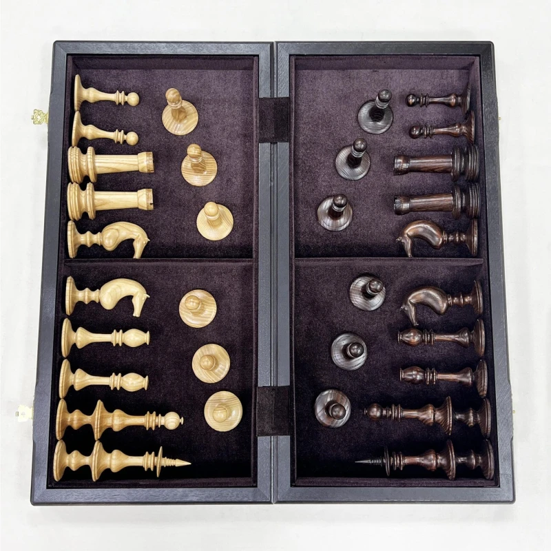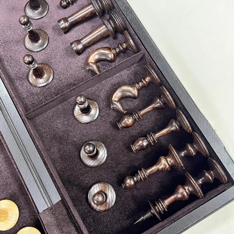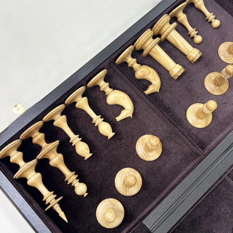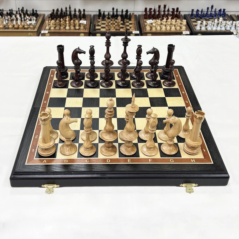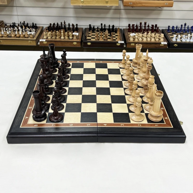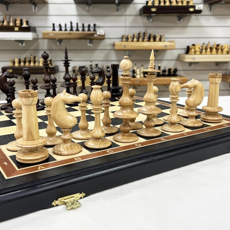 Подарочные шахматы ручной работы из ценных пород дерева. Размер доски в разложенном виде 50 на 50 см. Шахматная доска собирается вручную в технике маркетри. Темная клетка моренный дуб, светлая клетка ясень. Размер клетки 5 на 5 см. Шахматные фигуры выполнены в редком Ирландском стиле 19 века. Высота короля 14 см, высота пешки 7 см. Материал фигур массив ясеня. Сделаны в России. Внутри доска покрыта бархатом.