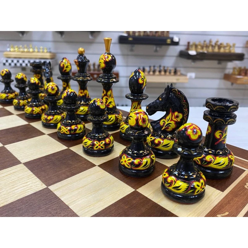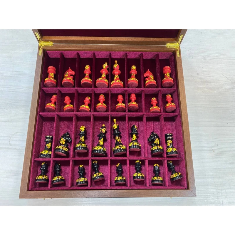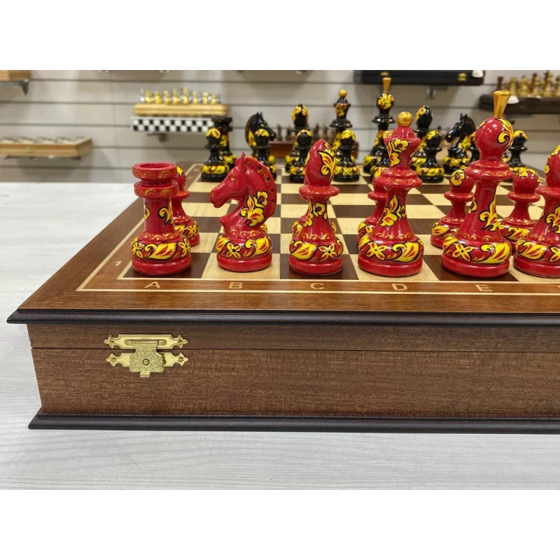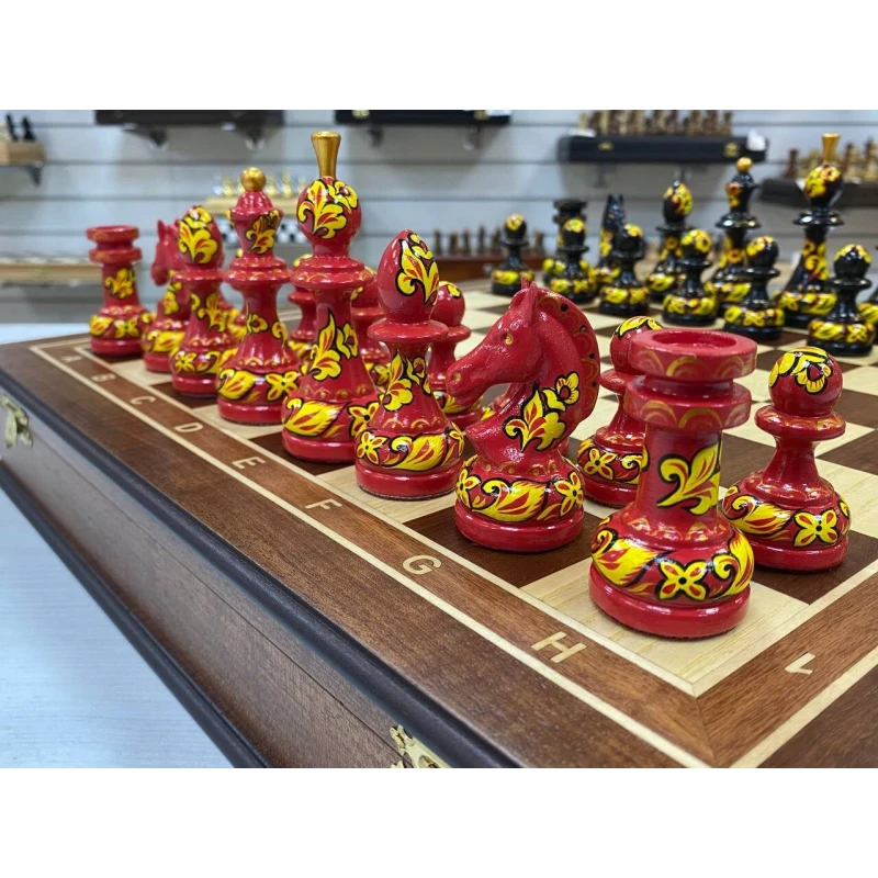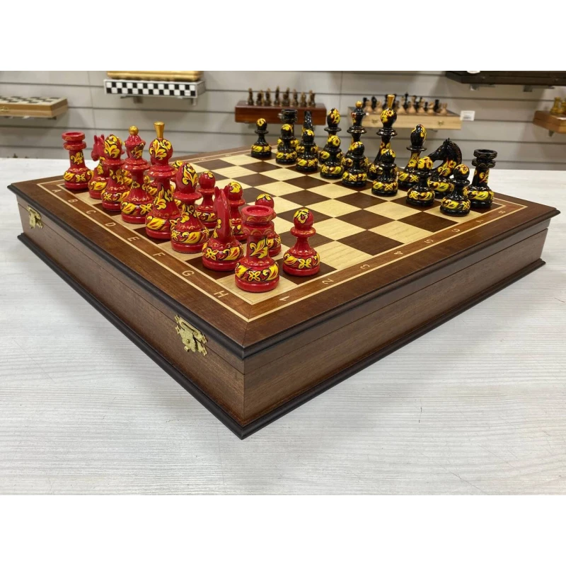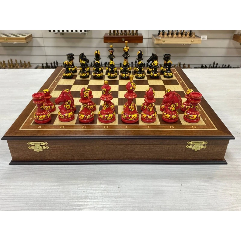 Эксклюзивные шахматы ручной работы в подарочном ларце из красного дерева. Материал фигур Кавказский граб. Шахматные фигуры расписаны вручную в технике Хохлома кудрина. Размер доски 45 на 45 см. Высота короля 10 см, высота пешки 5 см. Внутри доски есть ячейки для хранения фигур. Размер клетки 4.5 на 4.5 см. Подойдут в подарок для иностранцев.