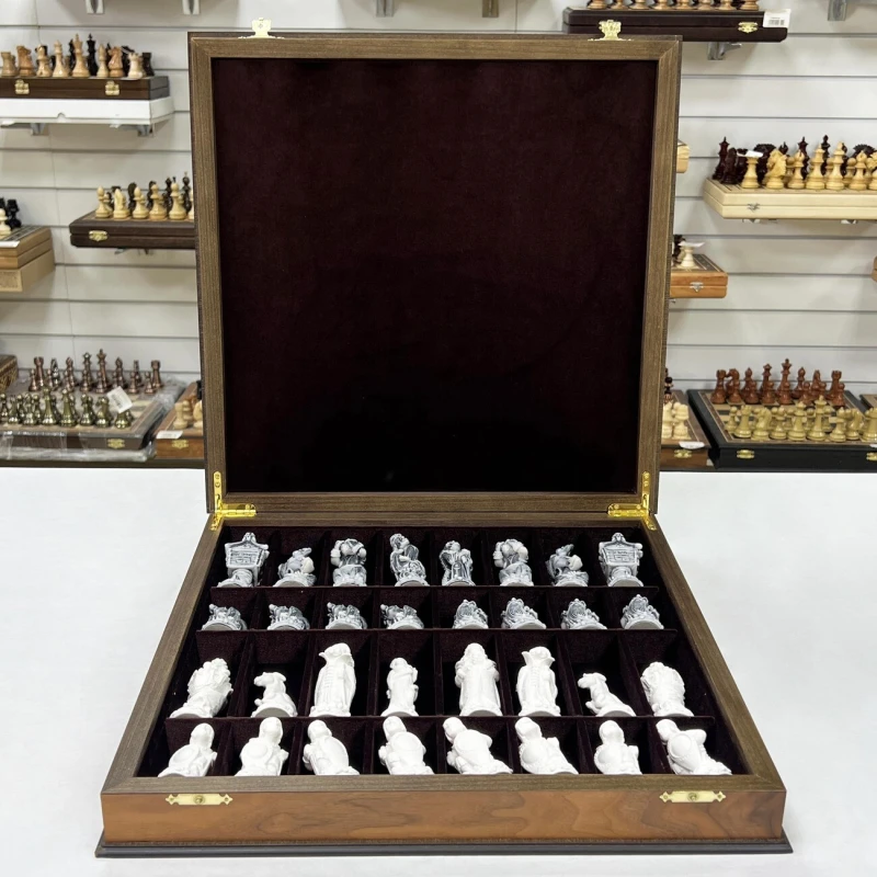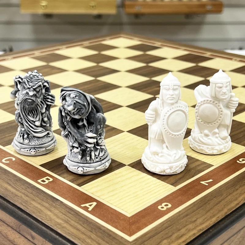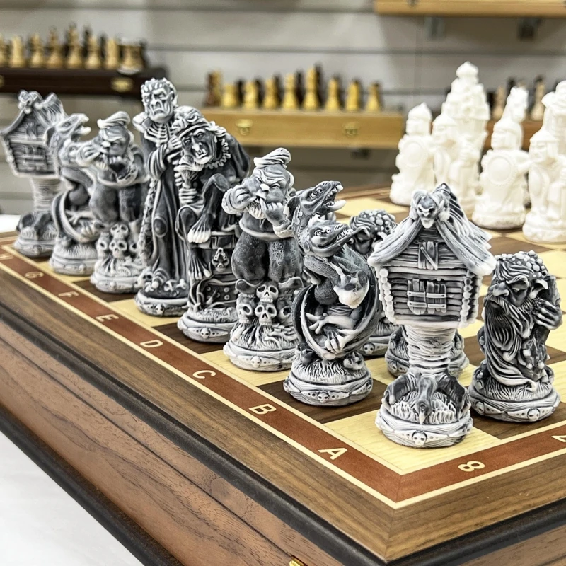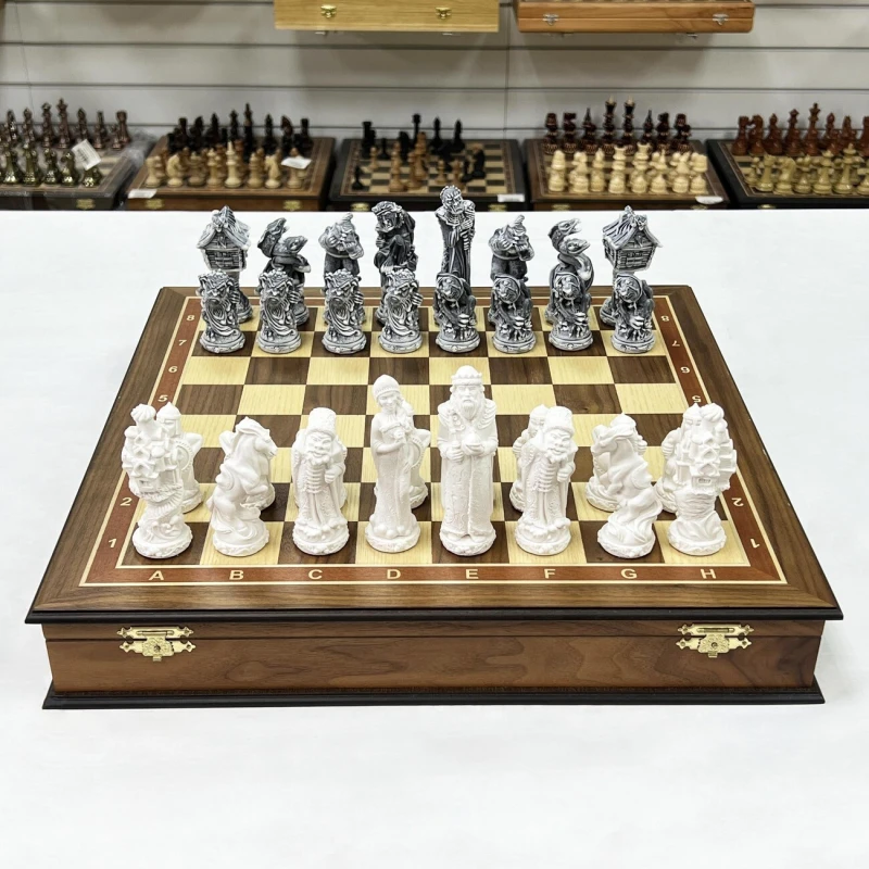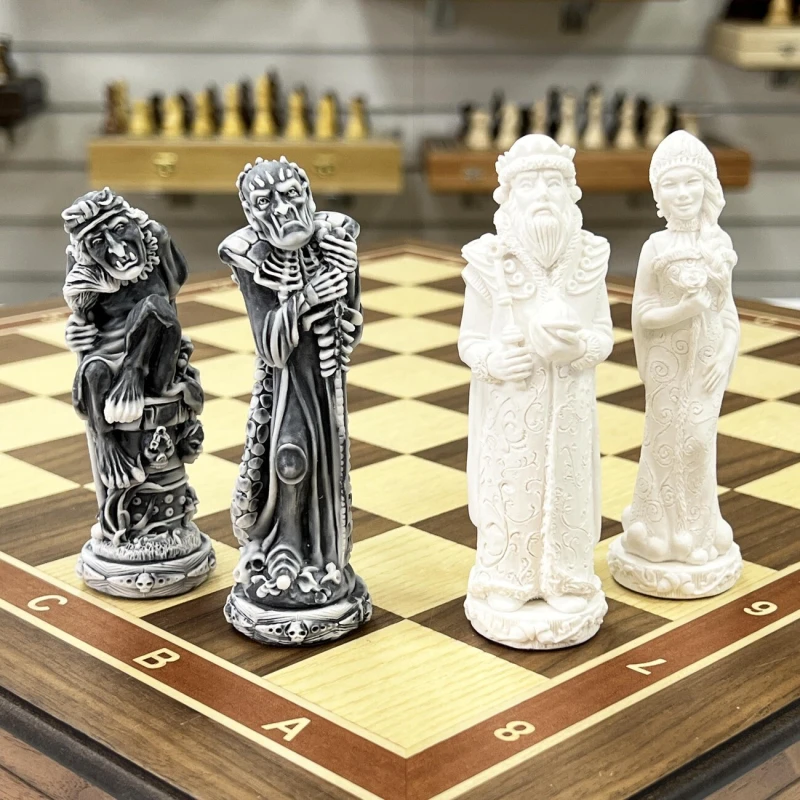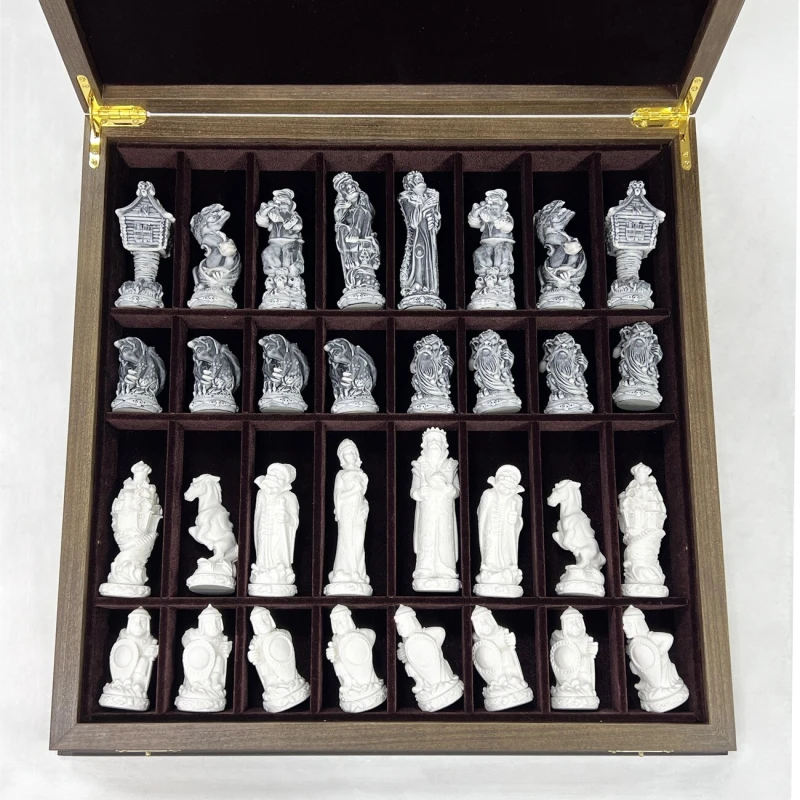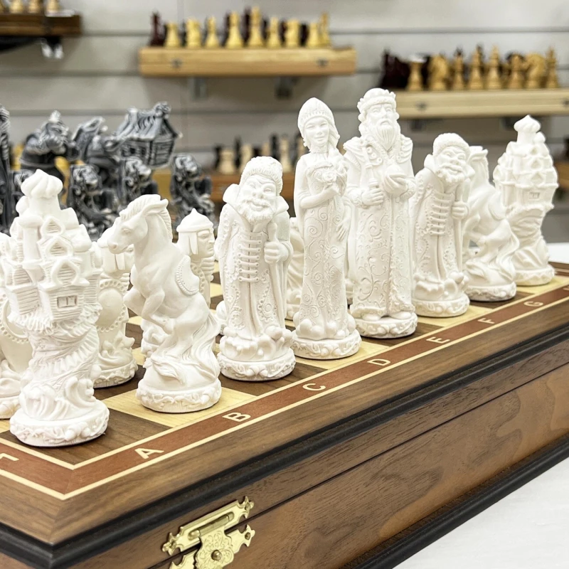 В комплекте используются фигуры серии «Русские сказки», изготовленные из литьевого мрамора. Фигуры белого цвела олицетворяют добрых персонажей русских народных сказок, а черные представляют собой отрицательных персонажей.