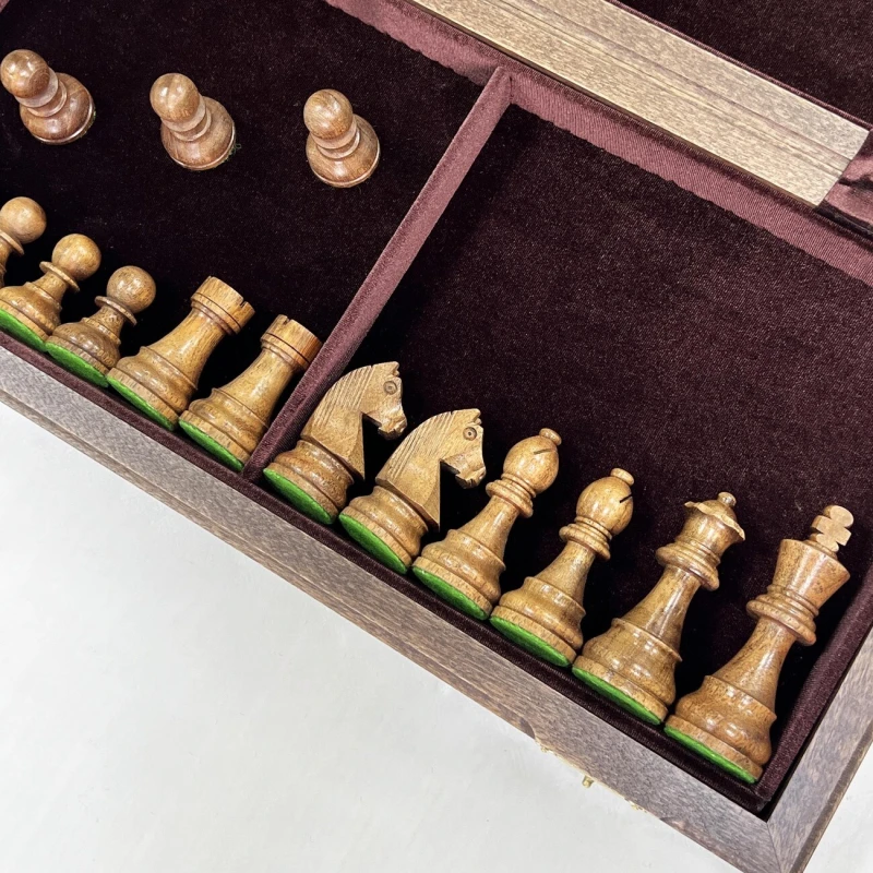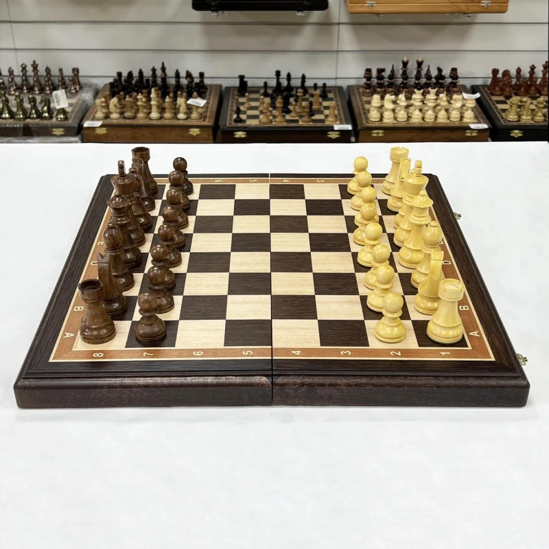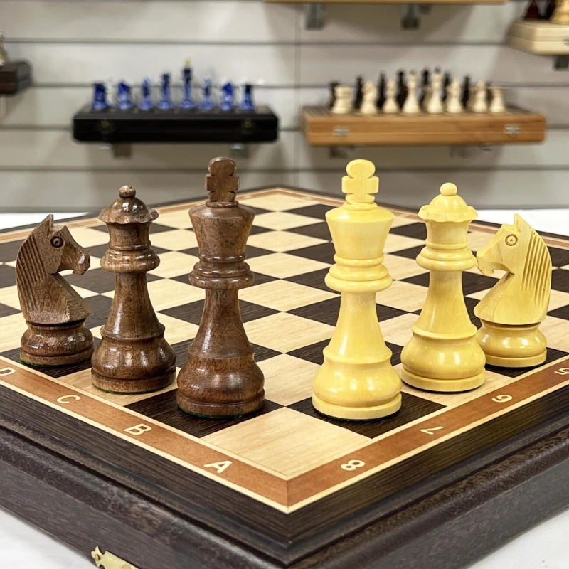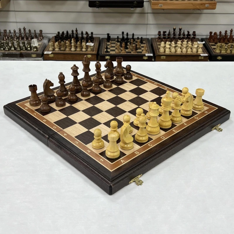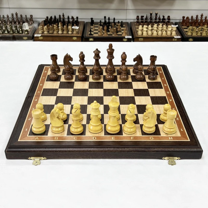 Изысканный шахматный набор ручной работы: доска из венге и ясеня создана в технике маркетри, с надежными замочками и бархатным внутренним пространством для хранения фигур. Размер доски в разложенном виде 45x45 см, клетка 4,5 см. Турнирные фигуры ручной работы, отполированные воском, выполнены из палисандра (темные) и самшита (светлые). Утяжелены и имеют подклейку у основания. Высота короля 9,5 см, пешки 4,5 см. Совершенство в каждой детали для истинных ценителей шахмат.