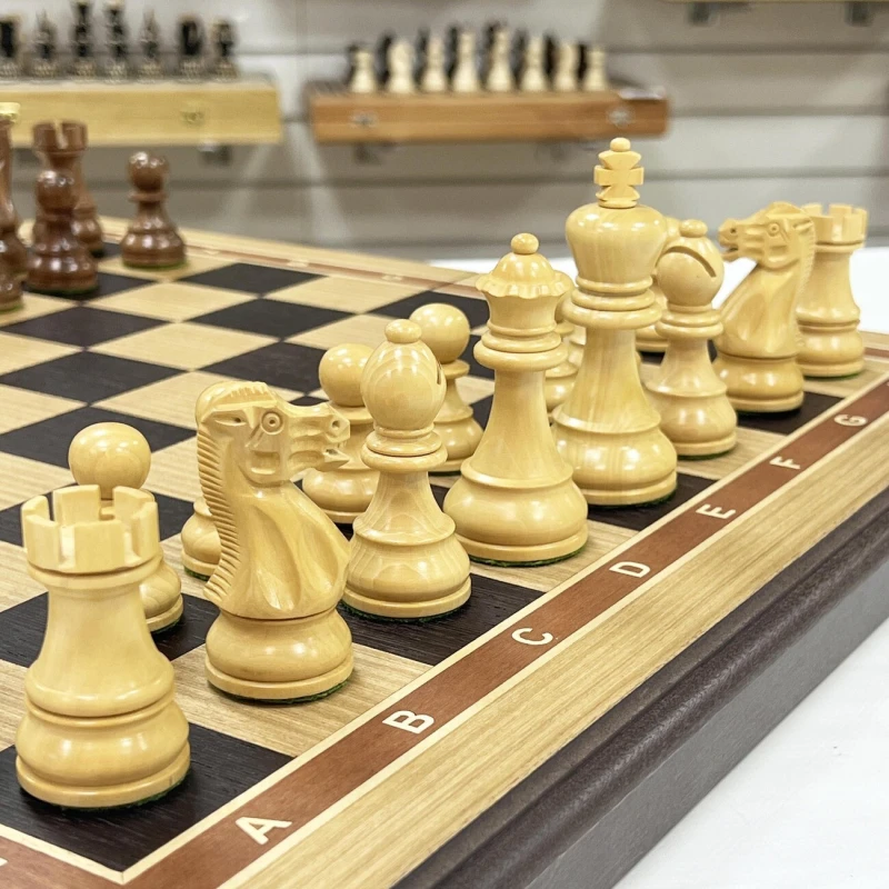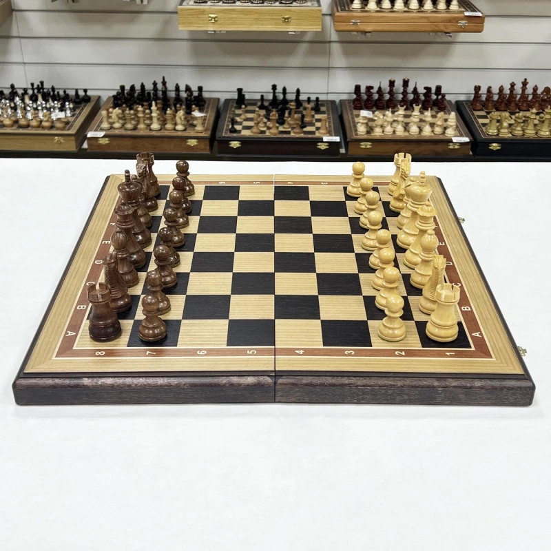 Шахматная доска – основа для игры в шахматы. Каркас данной модели доски выполнен из бука, а ее игровое поле покрыто шпоном различных ценных пород дерева, (дуб, светлый ясень, и прочее). Никакой цветной печати - каждый элемент доски, будь то клетка, цифры или буквы, а также поля доски выполнены из дерева.