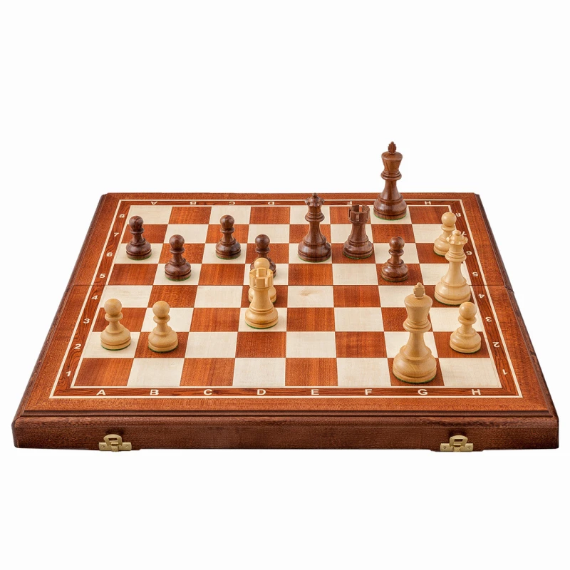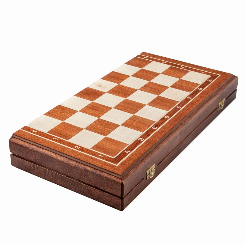 Шахматная доска – основа для игры в шахматы. Каркас данной модели доски выполнен из бука, а ее игровое поле покрыто шпоном различных ценных пород дерева, (махагон, светлый ясень, и прочее). Никакой цветной печати - каждый элемент доски, будь то клетка, цифры или буквы, а также поля доски выполнены из дерева.