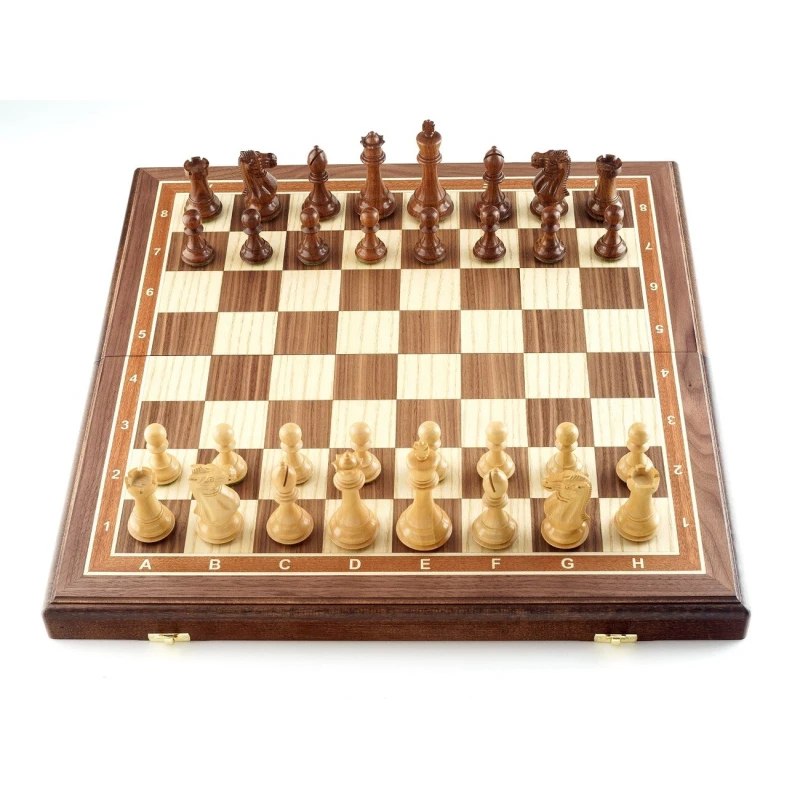 Шахматная доска – основа для игры в шахматы. Каркас данной модели доски выполнен из бука, а ее игровое поле покрыто шпоном различных ценных пород дерева, (орех, светлый ясень, и прочее). Никакой цветной печати - каждый элемент доски, будь то клетка, цифры или буквы, а также поля доски выполнены из дерева.