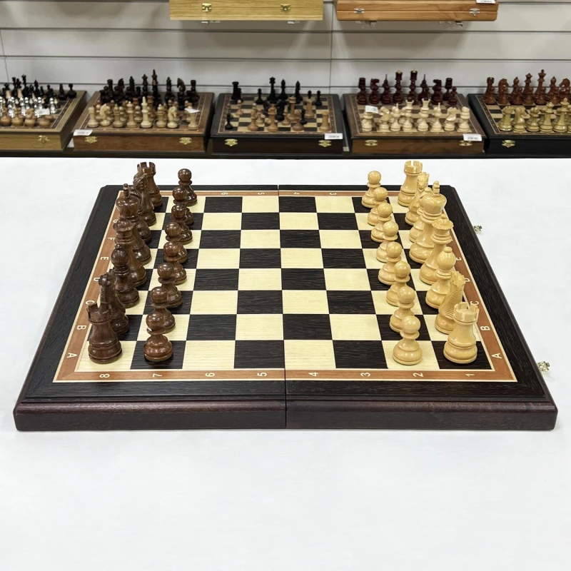 Шахматная доска – основа для игры в шахматы. Каркас данной модели доски выполнен из бука, а ее игровое поле покрыто шпоном различных ценных пород дерева, (венге, светлый ясень, и прочее). Никакой цветной печати - каждый элемент доски, будь то клетка, цифры или буквы, а также поля доски выполнены из дерева.