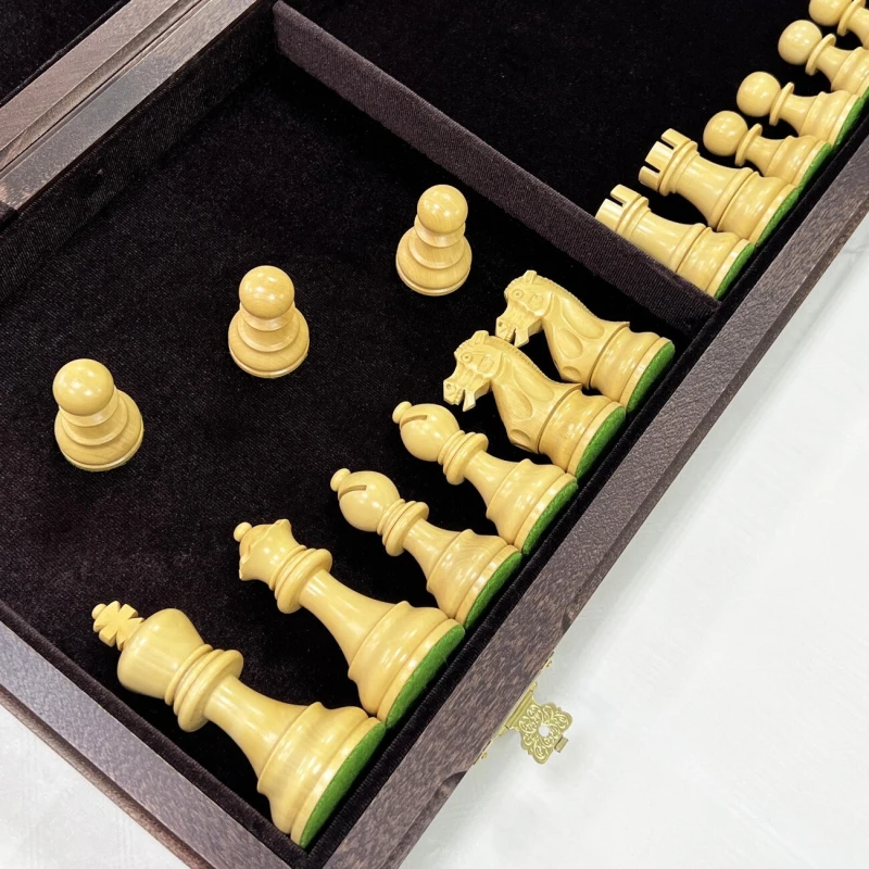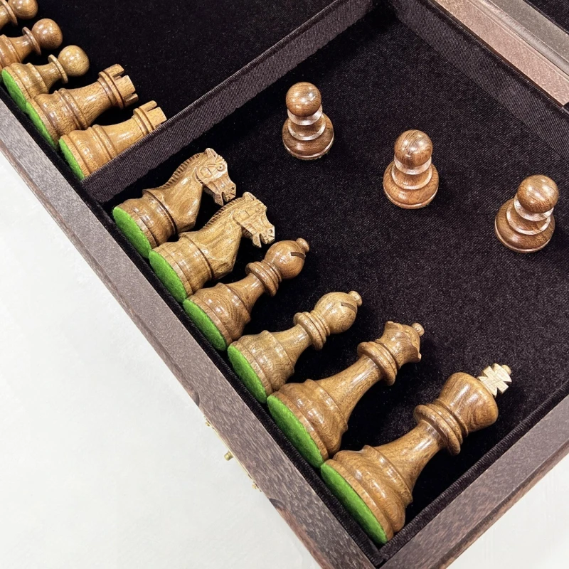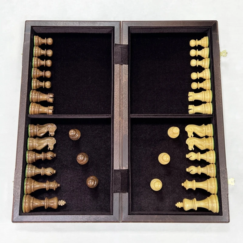 Шахматная доска выполнена складной. Это очень удобно как с точки зрения хранения шахматных фигур внутри доски, так и компактности, что облегчает процесс их перевозки. Внутренняя поверхность доски является местом для хранения фигур и обшита мягким высококачественным бархатом, что снижает износ фигур при хранении и их грохот при их транспортировке. Также бархатная обшивка, вне всяких сомнений, придает шахматам эстетичный и дорогой внешний вид.