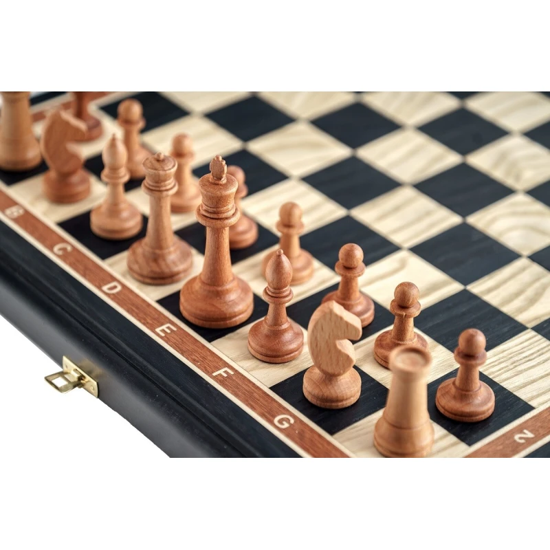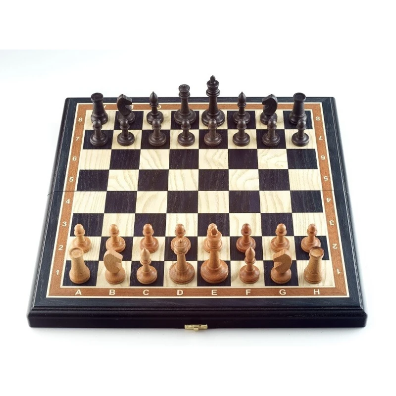 Шахматная доска – основа для игры в шахматы. Каркас данной модели доски выполнен из бука, а ее игровое поле покрыто шпоном различных ценных пород дерева, (мореный дуб, светлый ясень, и прочее). Никакой цветной печати - каждый элемент доски, будь то клетка, цифры или буквы, а также поля доски выполнены из дерева.